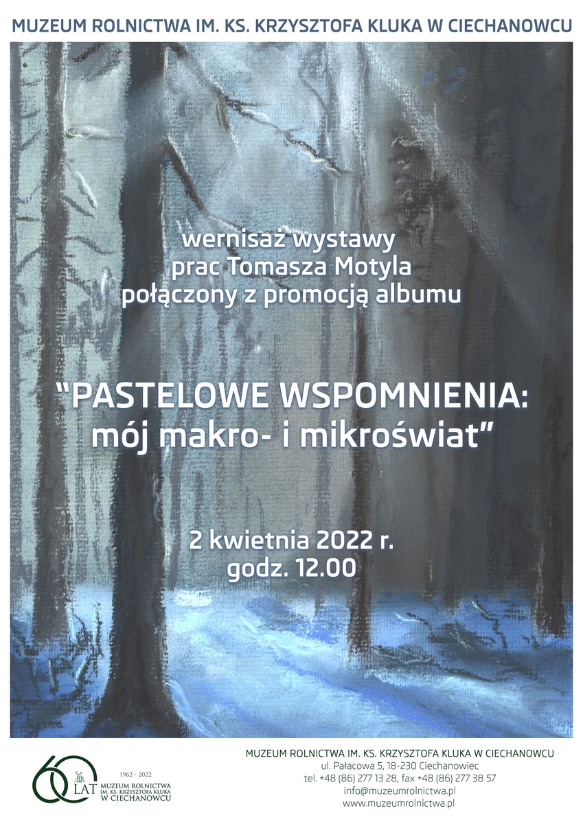 Dyrekcja Muzeum Rolnictwa im. ks. Krzysztofa Kluka w Ciechanowcu ma zaszczyt zaprosić na wernisaż wystawy prac Tomasza Motyla połączony z promocją albumu "Pastelowe wspomnienia: mój makro- i mikroświat".