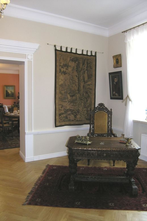 Na biurku pana domu rozłożono dokumenty majątkowe, korespondencję, przybory do pisania oraz najbardziej niezbędne do pracy książki. O tym, że nie tylko pracą człowiek żyje świadczy umieszczony na półeczce z przodu biurka kanon lektur – proza Sienkiewicza, Prusa, czytanych w wolnych chwilach. Stojący na biurku telefon na korbkę, świadczy o zamożności oraz otwartości na nowinki techniczne mieszkańców pałacu.