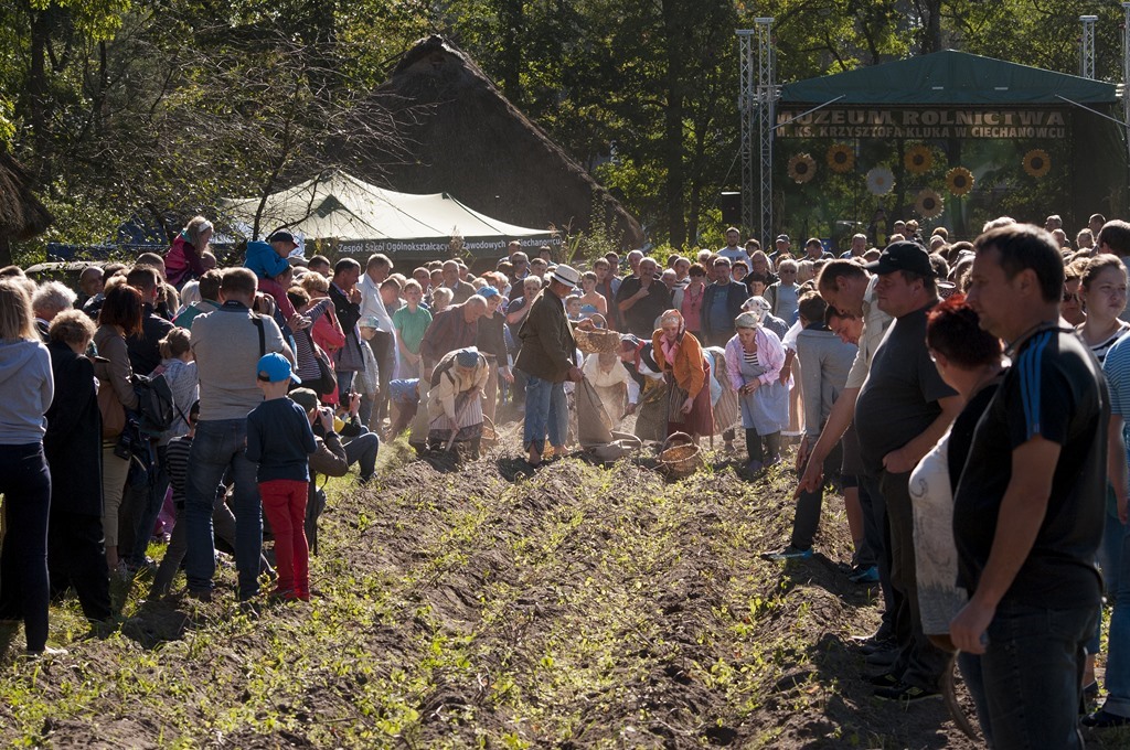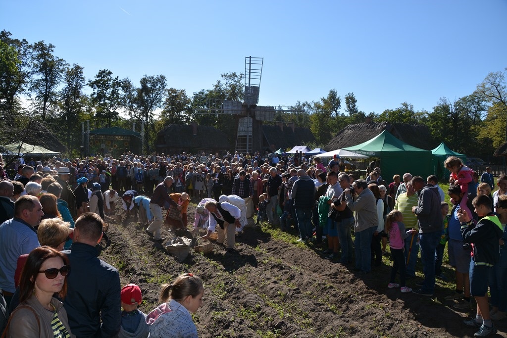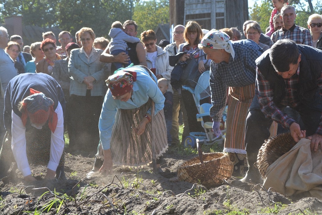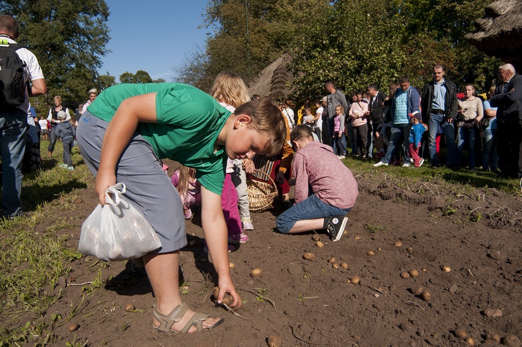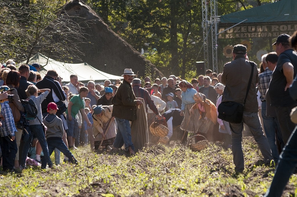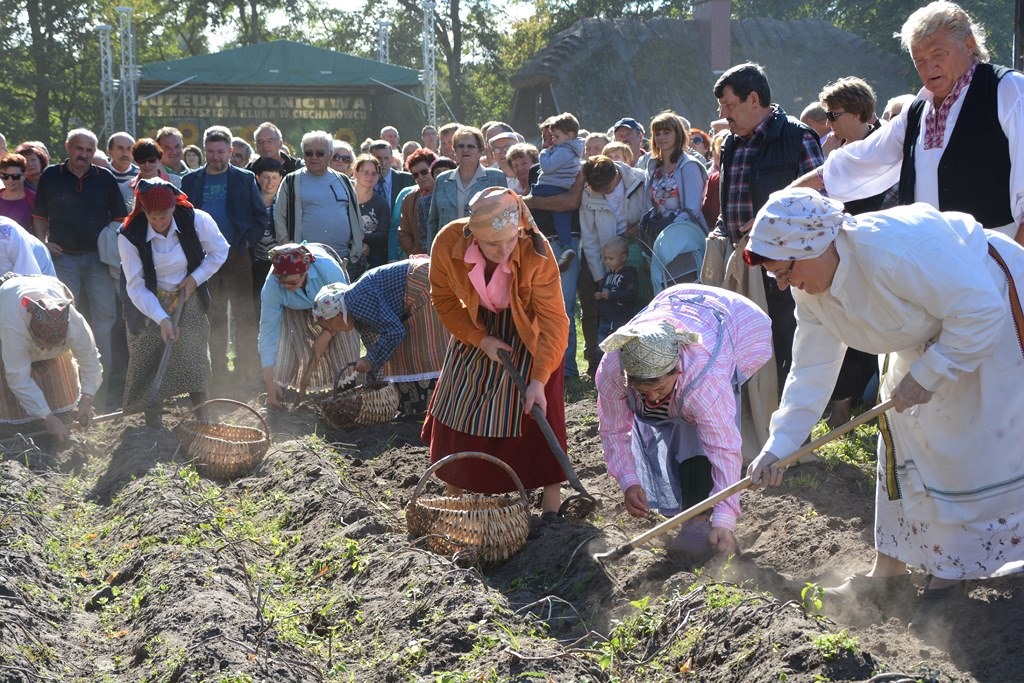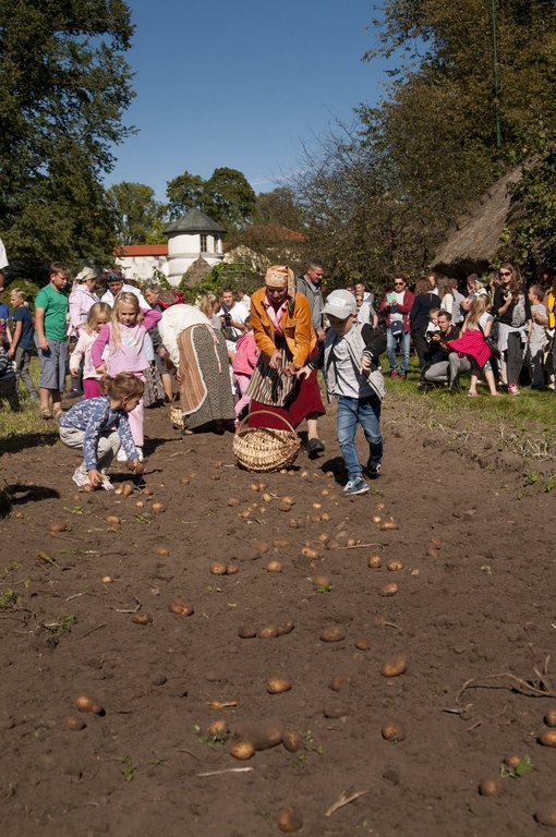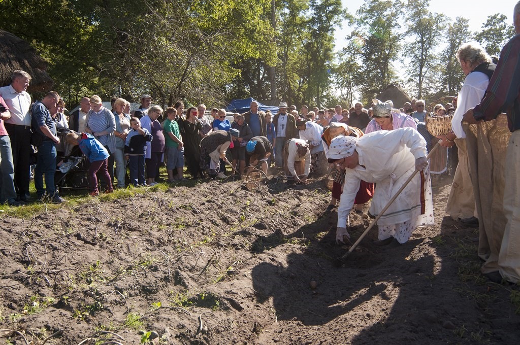 Wśród różnorodnej oferty imprez plenerowych, ten jesienny piknik stanowi najbogatsze w tradycje i zwyczaje wydarzenie etnograficzne w naszym muzeum. W scenerii wiejskiej zaprezentowaliśmy prace polowe i gospodarskie na dawnej wsi podlaskiej. Ten jesienny festyn rodzinny miał na celu przypomnienie i pokazanie tradycyjnych zwyczajów i obrzędów związanych z kopaniem ziemniaków i pracami gospodarskimi oraz domowymi w okresie jesiennym. Najważniejszym punktem programu był pokaz kopania ziemniaków motykami w wykonaniu zespołu ludowego Polne Maki z Dołubowa oraz kopaczką konną i tłoka - zbieranie ziemniaków za kopaczką z udziałem widzów. Po tym nast.ąpiło bronowanie kartofliska broną konną oraz orka.