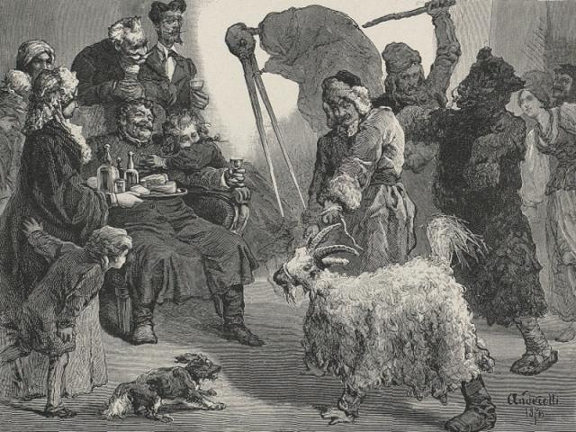 Andriolli. Wieśniaczy obrzęd "wodzenie kozy" przed polskim szlachcicem. Zachodnia Białoruś, XIX w.