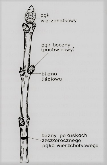 Schemat rozmieszczenia pąków na zdrewniałym pędzie zimowym.