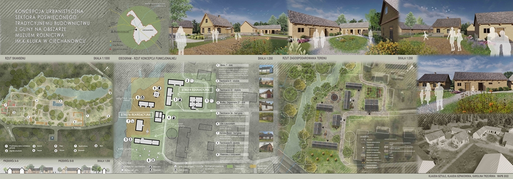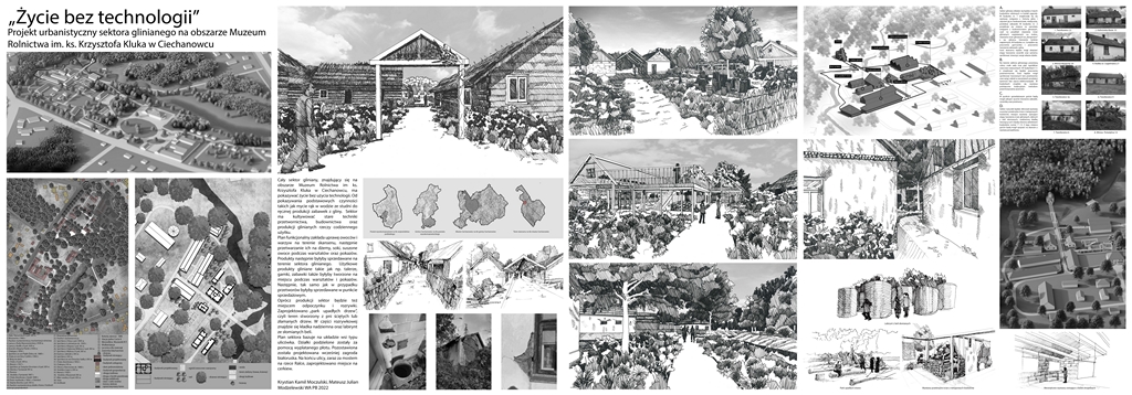 W roku akademickim 2021/2022 studenci III roku kierunku Architektura w ramach przedmiotu "Osadnictwo wiejskie - studium miejscowości gminnej" wzięli udział w organizowanym przez Muzeum Konkursie na opracowanie koncepcji "Sektora Glinianego" w Muzeum Rolnictwa im. Krzysztofa Kluka w Ciechanowcu.