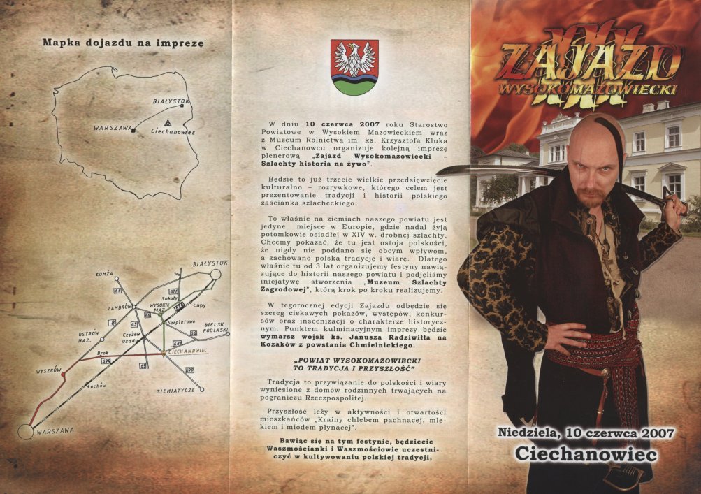 W dniu 10 czerwca br. na terenie Muzeum Rolnictwa w Ciechanowcu odbył się III Zajazd Wysokomazowiecki „Szlachty historia na żywo”. Imprezę o charakterze kulturalno – rozrywkowym już po raz trzeci zorganizowało wspólnie Starostwo Wysokomazowieckie i Muzeum Rolnictwa im. ks. Krzysztofa Kluka w Ciechanowcu z zamiarem, by bawiąc uczyć historii polskiego zaścianka szlacheckiego oraz tradycji i kultury naszych przodków. W przeddzień Zajazdu w Muzeum odbyła się również Międzynarodowa Konferencja Naukowa pt. „Dziedzictwo kulturowe szlachty a turystyka”.