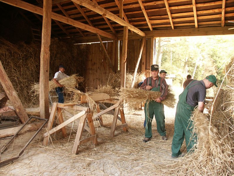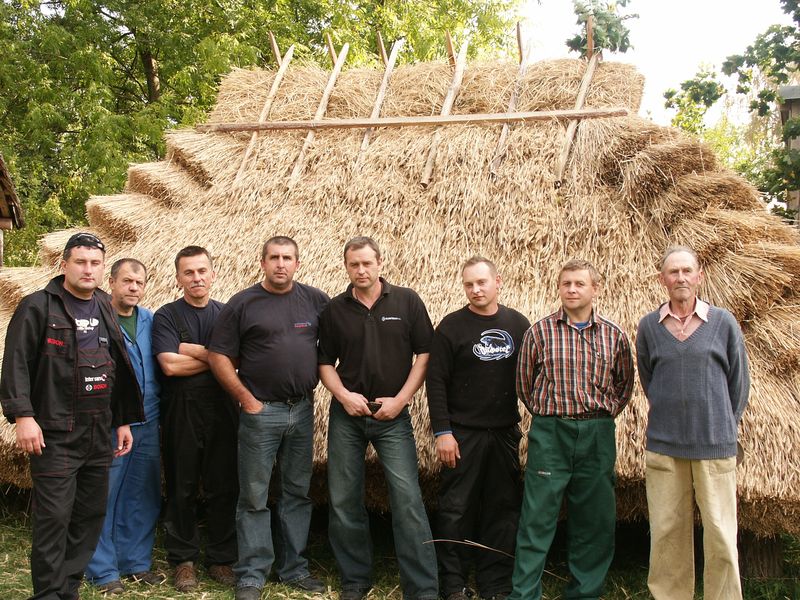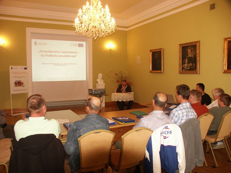 Podlaski Ośrodek Doradztwa Rolniczego w Szepietowie zakończył realizację zajęć teoretycznych i ćwiczeniowo – praktycznych w ramach projektu „Strzecharstwo zapomniane – na Podlasiu poszukiwane”, współfinansowanego ze środków Unii Europejskiej w ramach Europejskiego Funduszu Społecznego. Dwudniowe zajęcia teoretyczne odbyły się w Muzeum Rolnictwa im. ks. Krzysztofa Kluka w Ciechanowcu. Pierwszego dnia starszy kustosz muzeum – Antoni Mosiewicz zapoznał uczestników z tematem budownictwa drewnianego na Podlasiu oraz zasadami przygotowania słomy i techniką krycia dachów dwuspadowych i naczółkowych. Następnie kierownik oddziału Muzeum Podlaskiego w Białymstoku – Artur Gaweł przedstawił rodzaje konstrukcji więźb dachowych stosowanych w budownictwie drewnianym. Drugiego dnia uczestnicy projektu zapoznali się z zasadami BHP i P. Poż. przy wykonywaniu prac związanych z kryciem dachów słomą przedstawionymi przez Panią Krystynę Prorok – specjalistę ds. BHP i P. Poż. Podlaskiego Ośrodka Doradztwa Rolniczego w Szepietowie. Kolejnym tematem omówionym przez głównego specjalistę ds. zbóż – Stanisława Dudziuk była technologia uprawy zbóż z przeznaczeniem słomy jako materiału do krycia dachów strzechą. Ostatnim tematem wykładowym przedstawionym przez prof. dr hab. Krzysztofa Krajewskiego były środki i sposoby konserwacji budynków drewnianych krytych słomą. W czasie trwania wykładów uczestnicy zadawali dużo pytań prowadzącym, co świadczyło o dużym zainteresowaniu szkoleniem i potwierdziło, że szkolenie na ten temat było potrzebne.