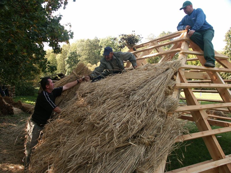 Zajęcia ćwiczeniowo – praktyczne odbyły się z podziałem na 4 grupy 3-osobowe, przeprowadzone przez instruktorów posiadających doświadczenie praktyczne w pokrywaniu dachów strzechą. Szkolenie praktyczne prowadzili: Stanisław Popławski i Jan Rzepnicki – pracownicy Muzeum Rolnictwa im. ks. Krzysztofa Kluka w Ciechanowcu oraz Wincenty Murawski i Władysław Szcześniak – emeryci, posiadający tę umiejętność. Ćwiczenia z przygotowania słomy do krycia dachów zostały przeprowadzone w miejscowości Nowodwory i Zadobrze - w gospodarstwach rolnych, w których zakupiono słomę. Uczestnicy bardzo szybko nauczyli się wytrząsania słomy oraz wiązania jej w snopki (główczaki i strzeszaki). Następnym ćwiczeniem przewidzianym w programie szkolenia była nauka krycia na przygotowanych daszkach ćwiczebnych nisko umieszczonych nad ziemią, gdzie każdy ze szkolonych przeszedł dwudniową naukę układania snopków na dachu. Ostatnim zadaniem zaplanowanym dla uczestników była wymiana pokrycia dachowego na czterospadowej oborze i dwuspadowym spichlerzu na terenie skansenu w Muzeum Rolnictwa w Ciechanowcu. Równolegle uczestnicy mieli okazje zobaczyć i poznać technikę krycia profesjonalnej firmy, z województwa lubelskiego, realizowaną na stodole znajdującej się w skansenie. Pracownicy tej firmy nauczyli techniki przygotowania słomy, krycia i organizacji pracy na dużych obiektach. Instruktorami byli panowie: Woźniak Przemysław i Kęcik Paweł. Pracownicy Muzeum Rolnictwa dodatkowo pokazali uczestnikom jak wykonywać ze słomy maty ogrodnicze, grube maty do uli, okrągłe daszki np. na ule, słomiane materace i warkocze.