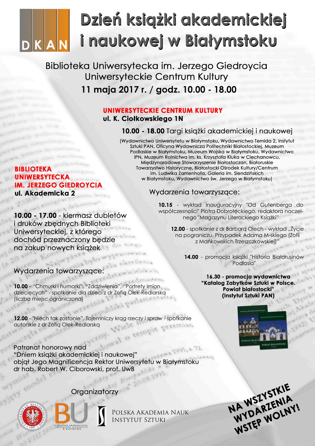 11 maja 2017 roku Biblioteka Uniwersytecka im. J. Giedroycia w Białymstoku organizuje „Dzień książki akademickiej i naukowej w Białymstoku 2017”. Będzie to wspaniała okazja do zapoznania się oraz nabycia nowości, które w ostatnim czasie ukazały się na rynku wydawniczym. Muzeum Rolnictwa im. ks. Krzysztofa Kluka w Ciechanowcu, podobnie jak wiele innych placówek naukowo-badawczych z terenu województwa podlaskiego, weźmie udział w tym wydarzeniu. Na naszym stoisku znajdzie się wiele cennych publikacji, pośród których każdy znajdzie coś interesującego dla siebie. Zapraszamy wszystkich do wzięcia udziału w tym wydarzeniu kulturalnym.