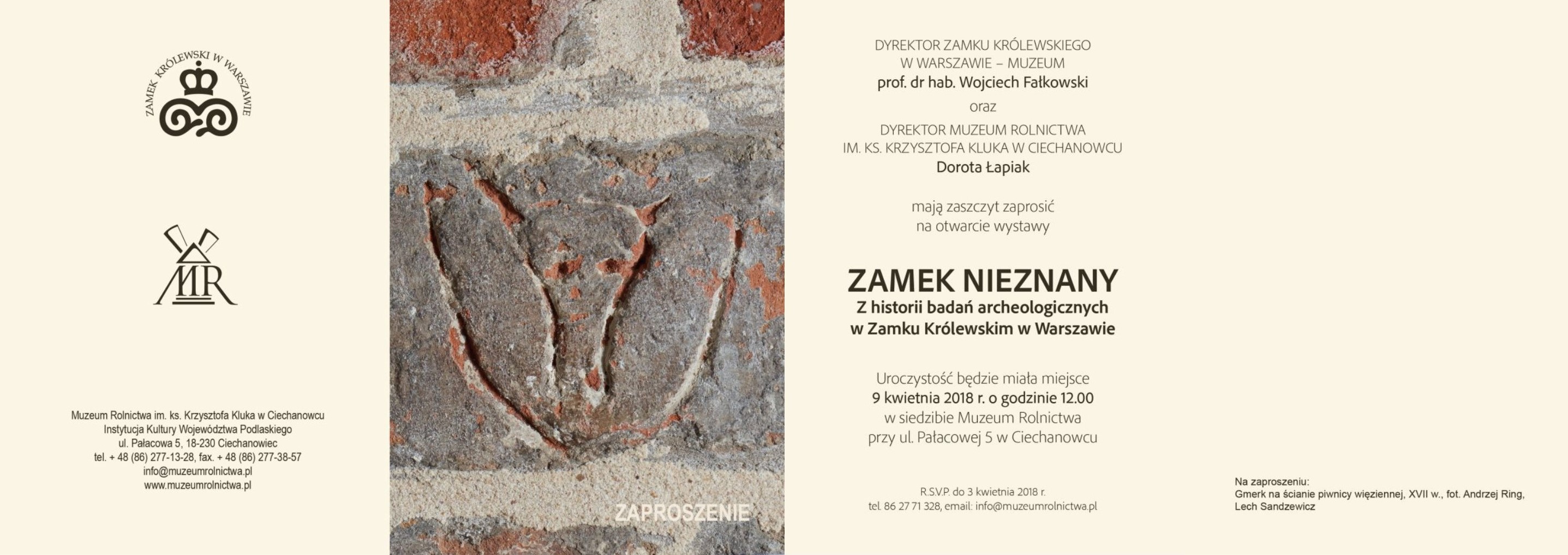 Wystawa czasowa „Zamek nieznany. Z badań archeologicznych w Zamku Królewskim w Warszawie” przygotowana przez Jana Łozińskiego – pracownika Działu Archeologicznego Zamku Królewskiego w Warszawie – Muzeum będzie udostępniona od 9 kwietnia do 3 czerwca 2018 r. w siedzibie Muzeum Rolnictwa im. ks. Krzysztofa Kluka w Ciechanowcu.