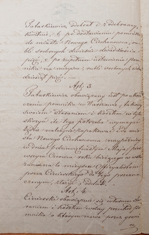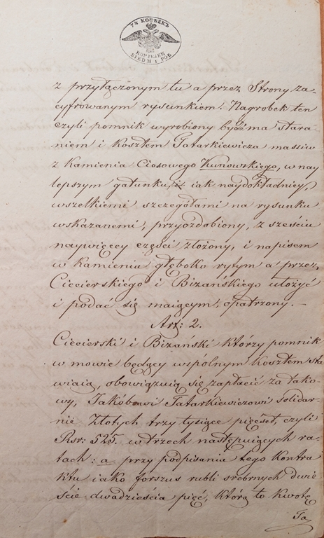 Obok akt majątkowych, w zbiorach Archiwum trafiają się niezwykle ciekawe dokumenty dotyczące spraw daleko od nich odbiegających. Jednym z takich dokumentów jest rękopiśmienna umowa, zawarta w Warszawie 1 (13) marca 1848 roku, pomiędzy Stefanem Ciecierskim i Janem Nepomucenem Bizańskim – malarzem z Krakowa, z jednej strony, a Jakóbem Tatarkiewiczem, o wykonanie rzeźbionego ... w kamieniu ciosowym kunowskim... nagrobka według załączonego rysunku i dostarczenia go do Nowego Miasta Ciechanowca. Na stronie siódmej wspomnianego dokumentu, znajduje się rysunek nagrobka wykonany ołówkiem przez samego Jakuba Tatarkiewicza oraz jego odręczny podpis: Jakób Tatarkiewicz Prof. Rzeźby.