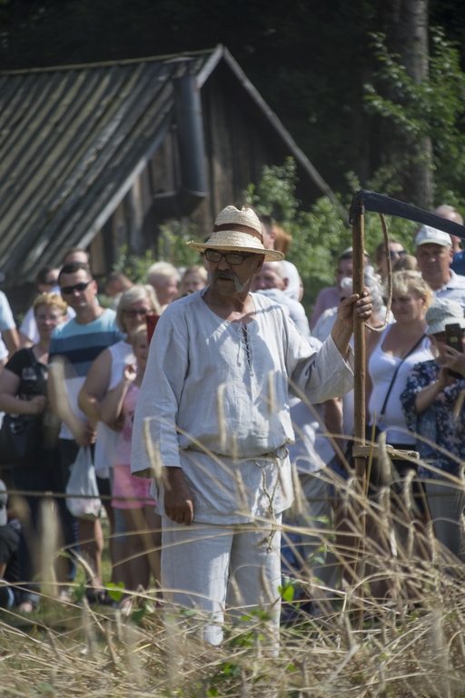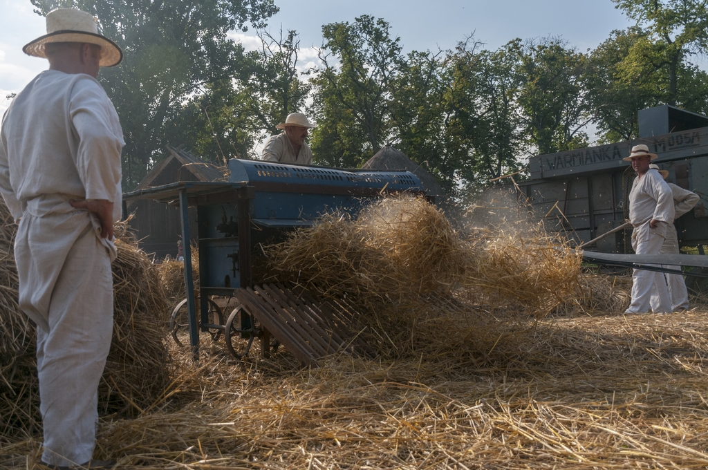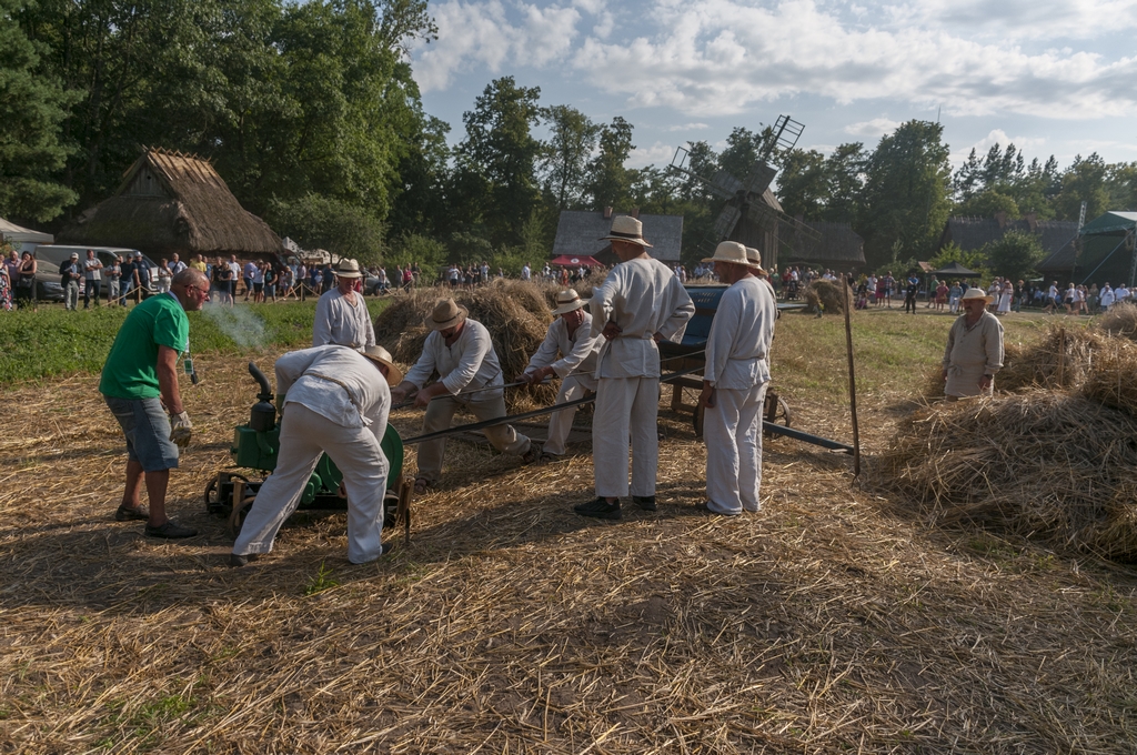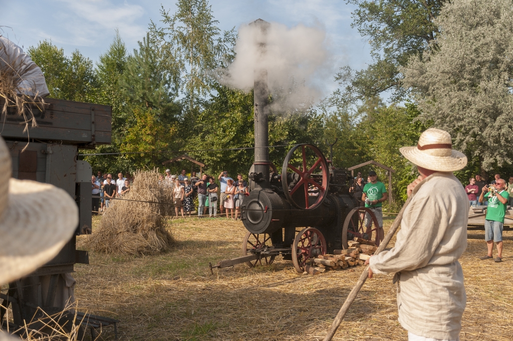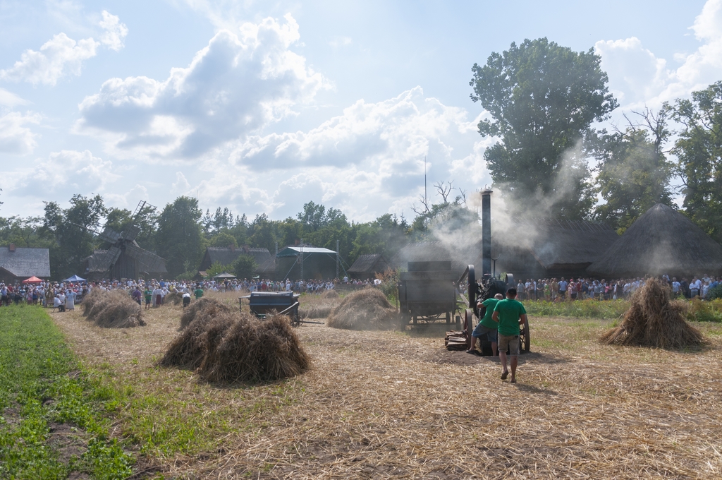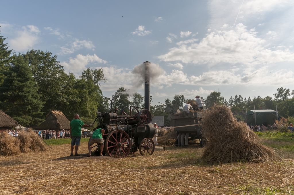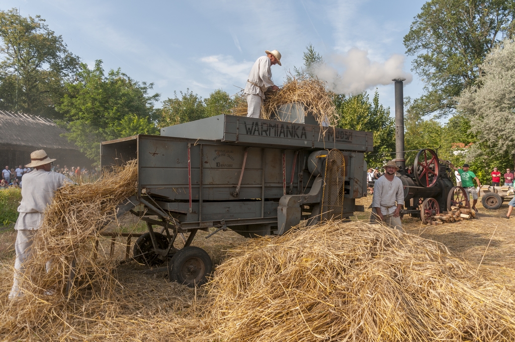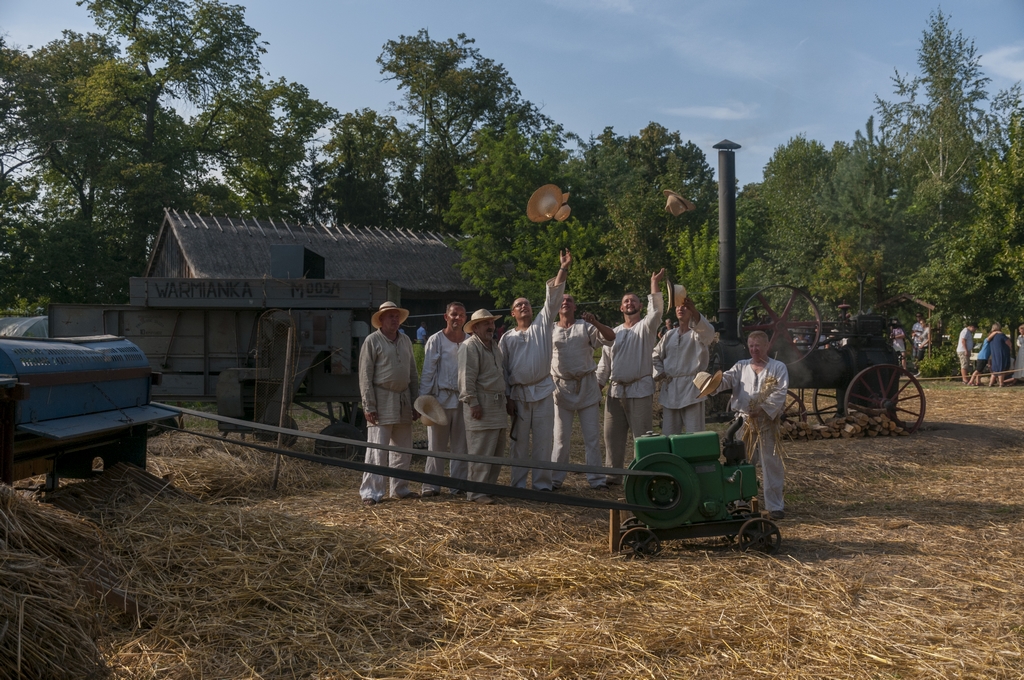 Następnym punktem prac polowych był pokaz młócenia zboża młocarnią Warmianką MSC-7 z 1984 r. napędzaną lokomobilą z 1922 r. firmy „HEINRICH LANZ” z Mannheim. Zboże młócone było również tradycyjną młocarnią szerokomłotną MS 1-A z 1959 r. napędzaną silnikiem stacjonarnym S-320E z 1964 r. Pokazom towarzyszył ciągnik URSUS C-328 z 1963 r.