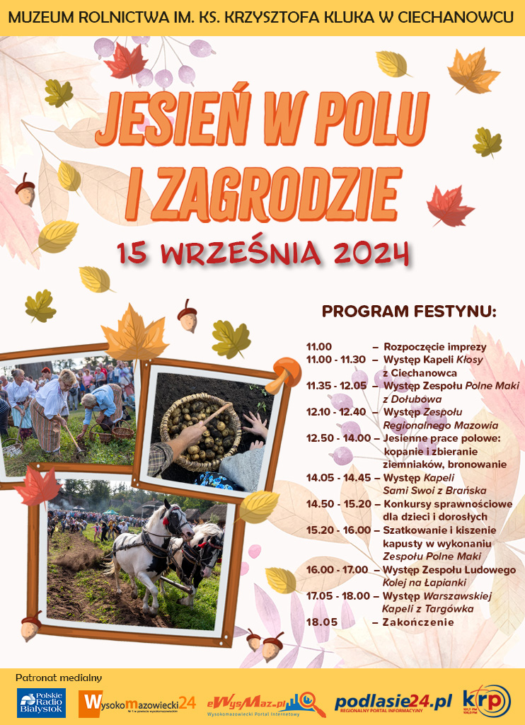 Serdecznie zapraszamy na wrześniową imprezę folklorystyczną ,,Jesień w polu i zagrodzie" , która odbędzie się 15 września 2024 r. na terenie Muzeum Rolnictwa w Ciechanowcu w godz. 11.00 – 18.00.