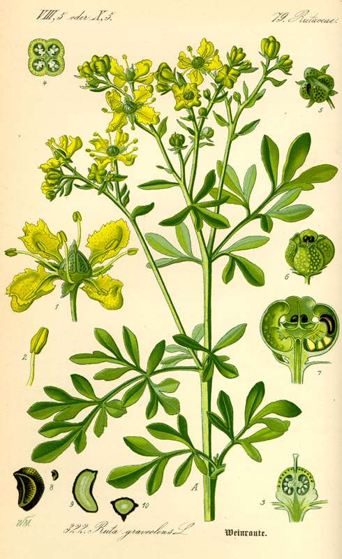 Ruta zwyczajna (Ruta graveolens): Wieśniacy surowey zażywaią na chlebie z masłem, osobliwie z rana, i tym się maią za ubezpieczonych przeciwko uszkodzeniom zepsowanego powietrza (Krzysztof Kluk Dykcyonarz roślinny Tom III, 1788)