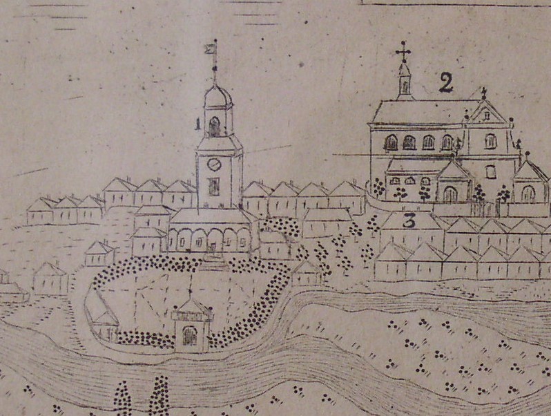 Zameczek. Fragment osiemnastowiecznej panoramy miasta autorstwa Krzysztofa Kluka – ze zbiorów Muzeum Rolnictwa im. ks. Krzysztofa Kluka w Ciechanowcu
