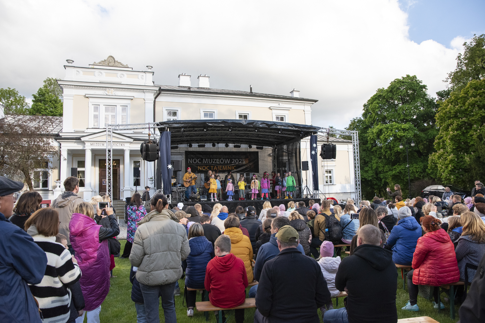 O godzinie 18.00 na scenie przed pałacem pojawiła się Arka Noego, w otoczeniu utalentowanych młodych wokalistów. Ich występ wprowadził wszystkich w radosny nastrój, a czas spędzony na koncercie minął zaskakująco szybko.Wieczór zakończył się projekcją filmu "Zegar Czarnoksiężnika" o godzinie 21.00, zaś nasi goście mieli okazję zwiedzać otwarte ekspozycje do północy. Dla tych, którzy zgłodnieli, przygotowaliśmy pyszne placki ziemniaczane, chleb ze smalcem oraz piwo jałowcowe. Dziękujemy wszystkim, którzy wzięli udział w tej magicznej nocy! Już teraz zapraszamy na kolejną edycję za rok. Wasza obecność sprawiła, że to wydarzenie było naprawdę wyjątkowe! Zachęcamy do obejrzenia naszej fotorelacji i przypomnienia sobie wszystkich wspaniałych chwil spędzonych podczas Nocy Muzeów 2025!
