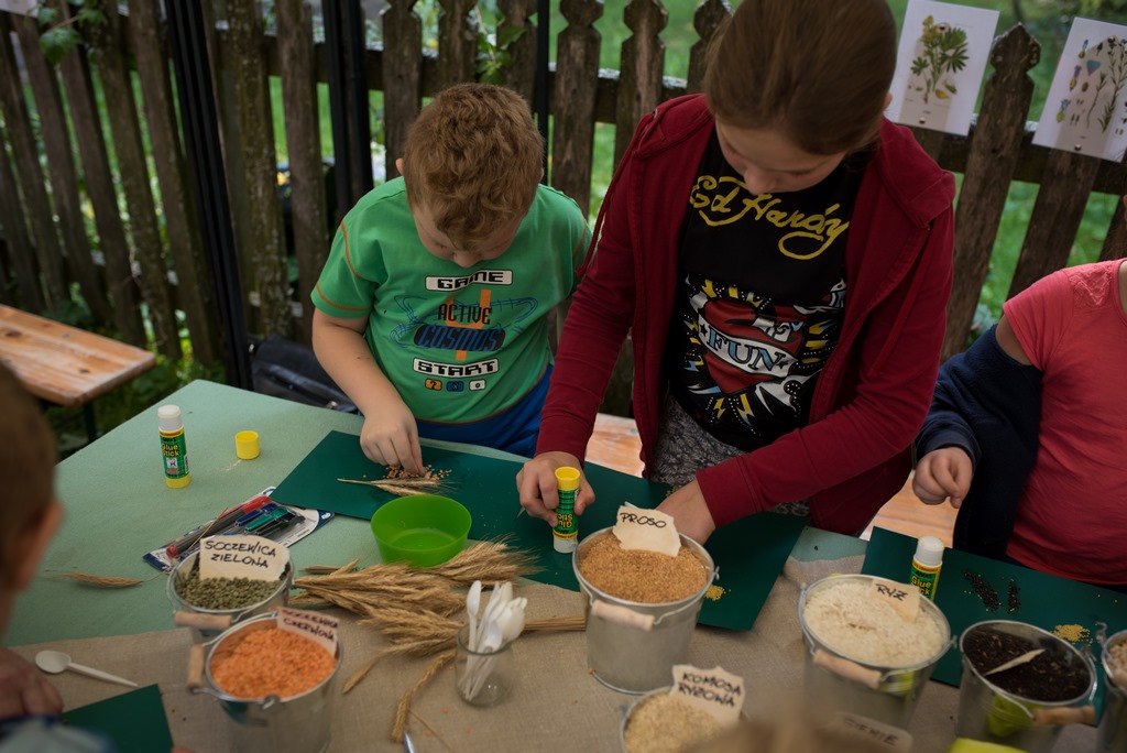 Najmłodsi uczestnicy imprezy z chęcią uczestniczyli w zabawach sprawnościowych oraz zajęciach plastycznych – tworząc ekoobrazy z nasion zbóż.