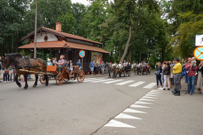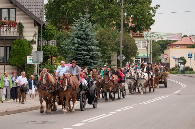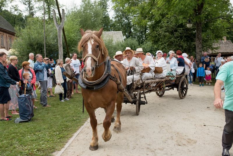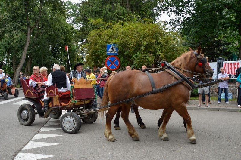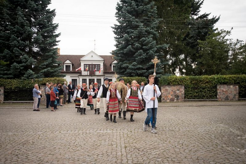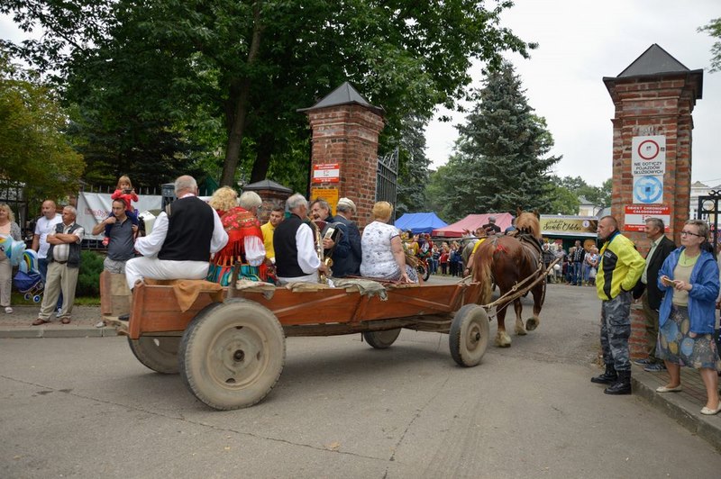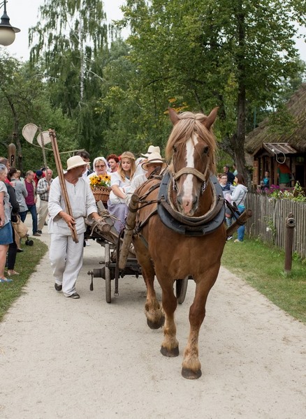 w Ciechanowcu, po zakończeniu której goście i zespoły folklorystyczne zaprzęgami konnymi wrócili do muzeum. Barwny korowód otwierał wóz drabiniasty z wieńcem dożynkowym. Tuż za nim jechały wozy konne i bryczki