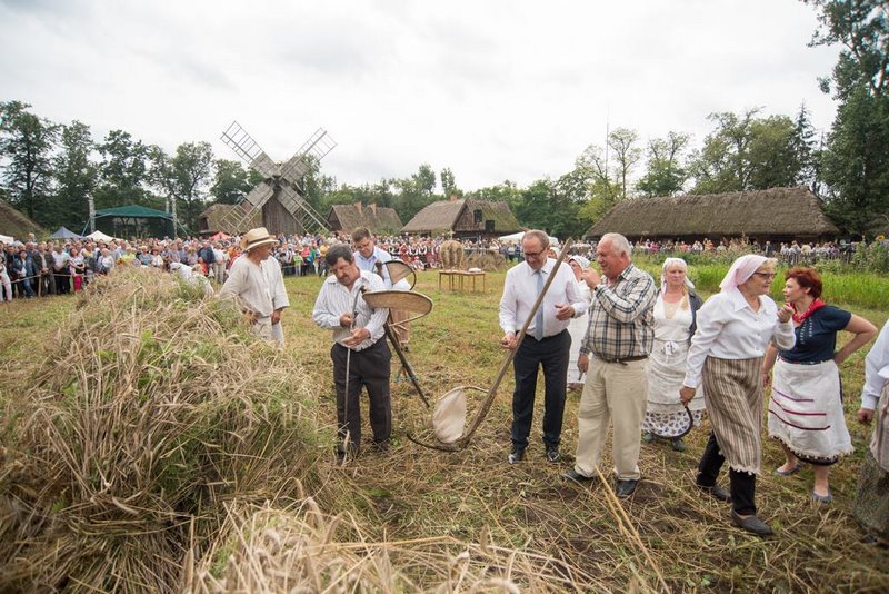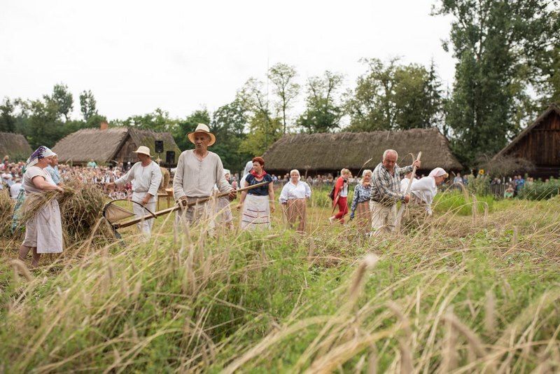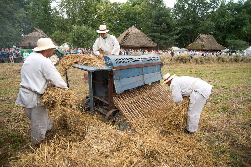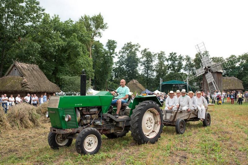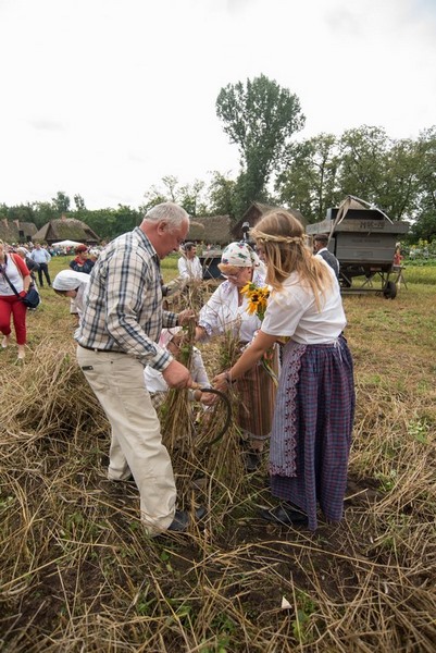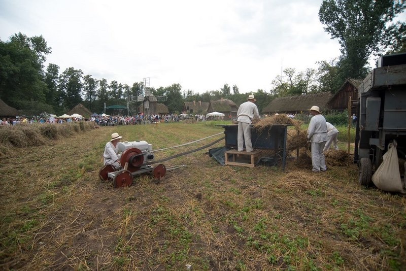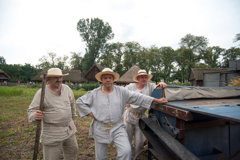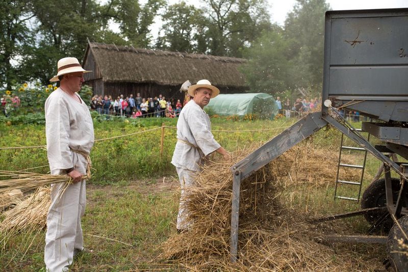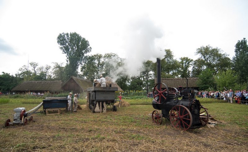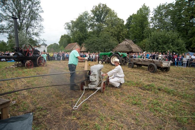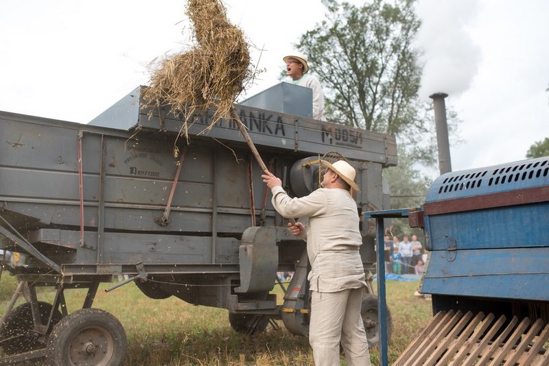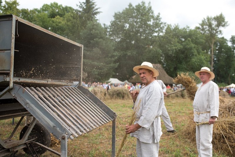 w barwnym korowodzie z równianką, chlebem i wieńcem dożynkowym udali się do dworu, gdzie gospodarze po uroczystym powitaniu ugościli ich, wyprawiając dożynki. Następnym punktem prac polowych był pokaz młócenia zboża młocarnią Warmianką MSC-7 z 1984 r. napędzaną lokomobilą z 1922 r. firmy „HEINRICH LANZ” z Mannheim. Zboże młócone było również tradycyjną młocarnią szerokomłotną SM 1-A z 1959 r. napędzaną silnikiem stacjonarnym S-320 z 1964 r. Równolegle w jednej ze stodół na skansenie odbywał się pokaz młócenia zboża cepami na klepisku.