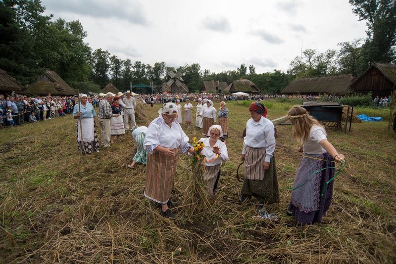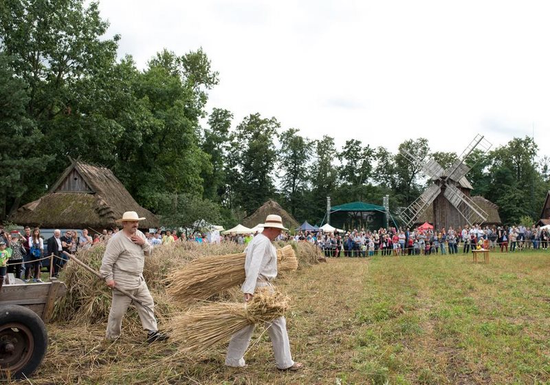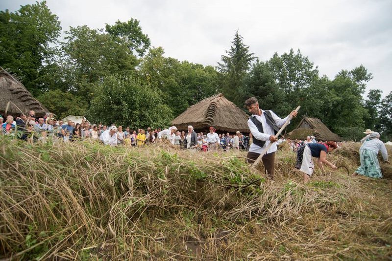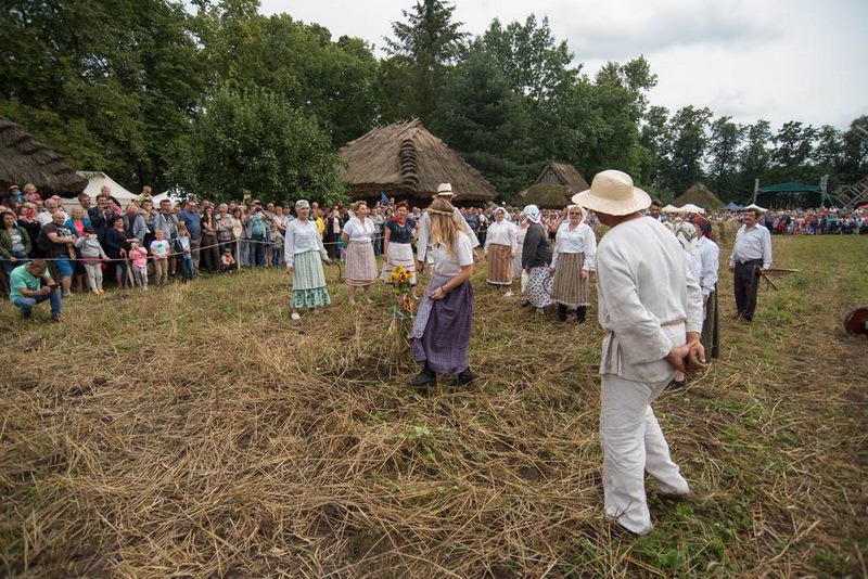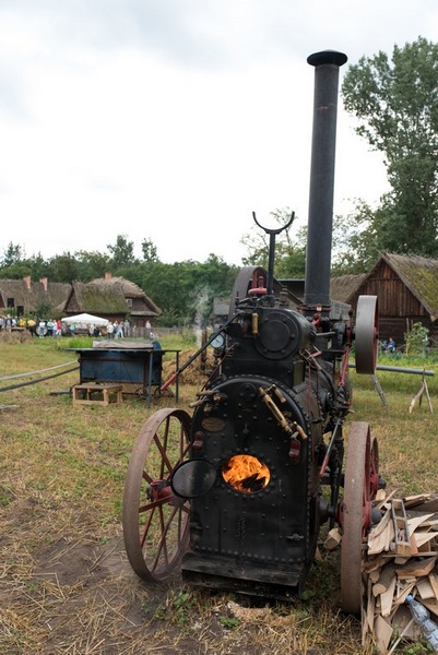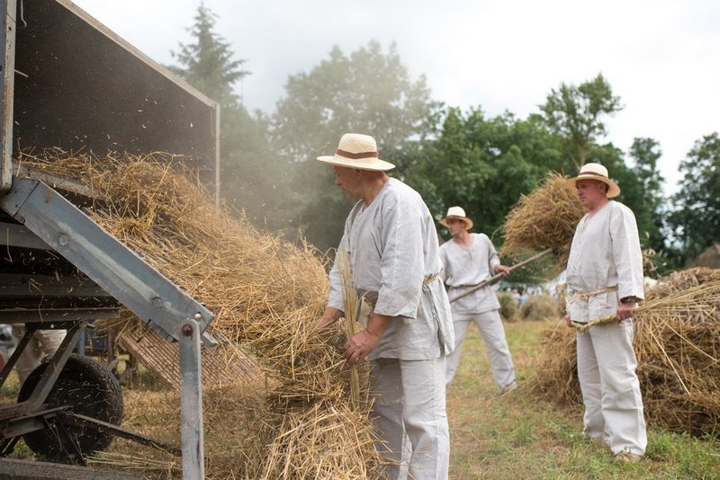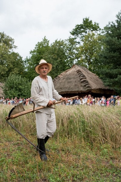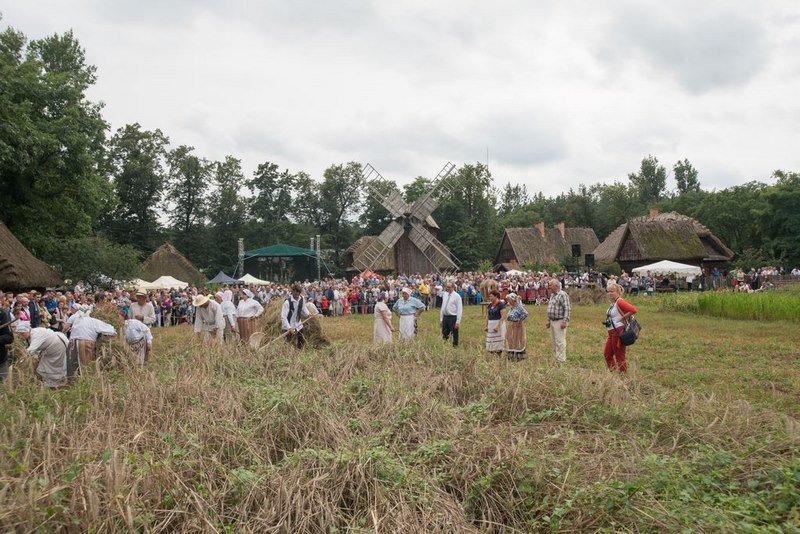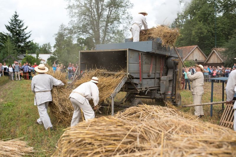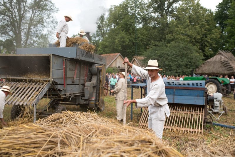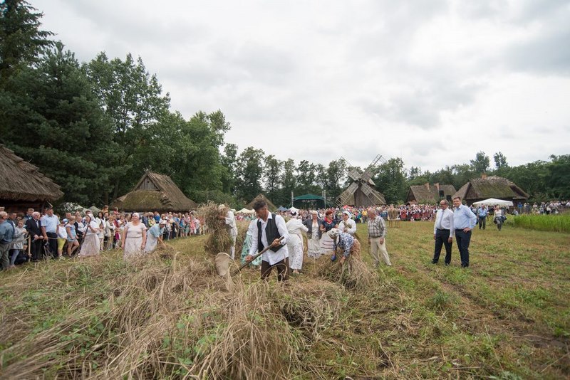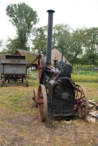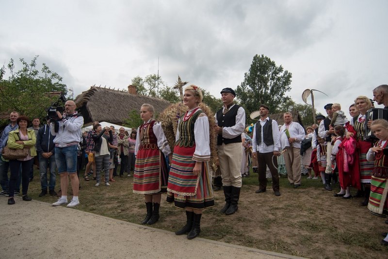 w barwnym korowodzie z równianką, chlebem i wieńcem dożynkowym udali się do dworu, gdzie gospodarze po uroczystym powitaniu ugościli ich, wyprawiając dożynki. Następnym punktem prac polowych był pokaz młócenia zboża młocarnią Warmianką MSC-7 z 1984 r. napędzaną lokomobilą z 1922 r. firmy „HEINRICH LANZ” z Mannheim. Zboże młócone było również tradycyjną młocarnią szerokomłotną SM 1-A z 1959 r. napędzaną silnikiem stacjonarnym S-320 z 1964 r. Równolegle w jednej ze stodół na skansenie odbywał się pokaz młócenia zboża cepami na klepisku.