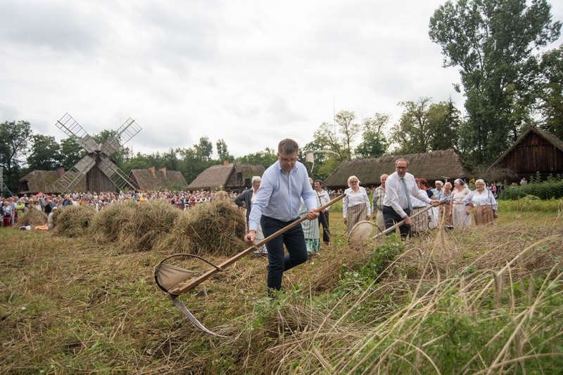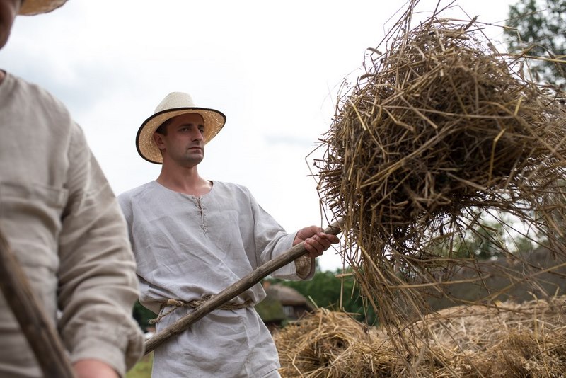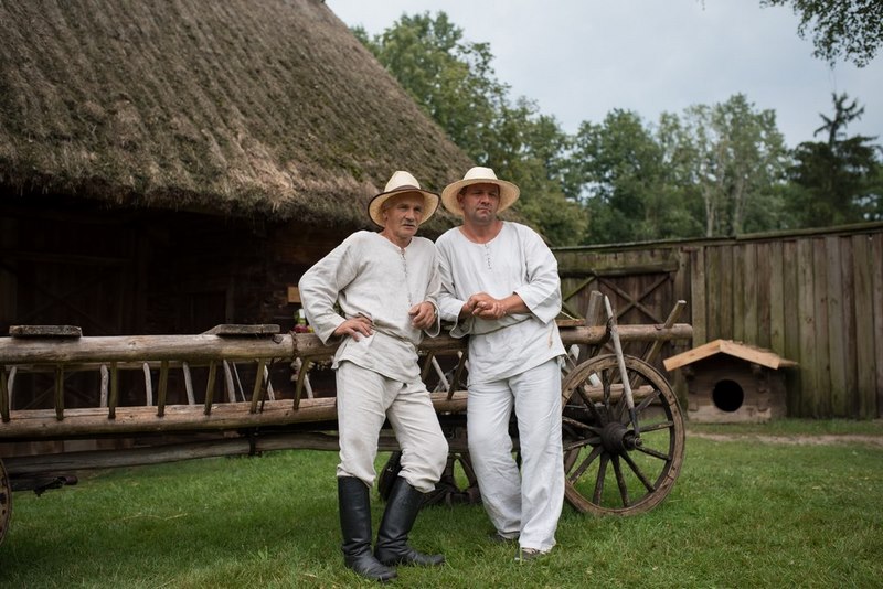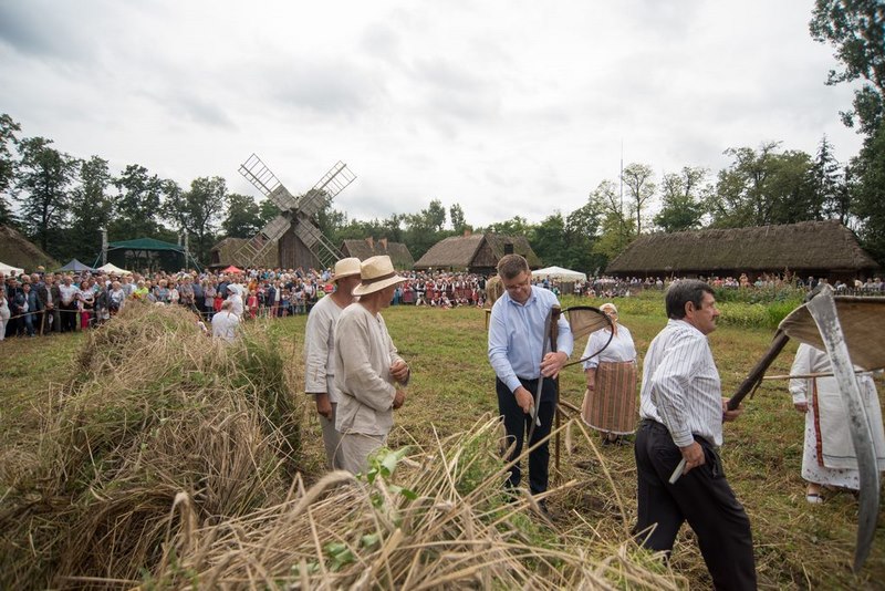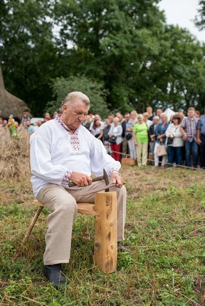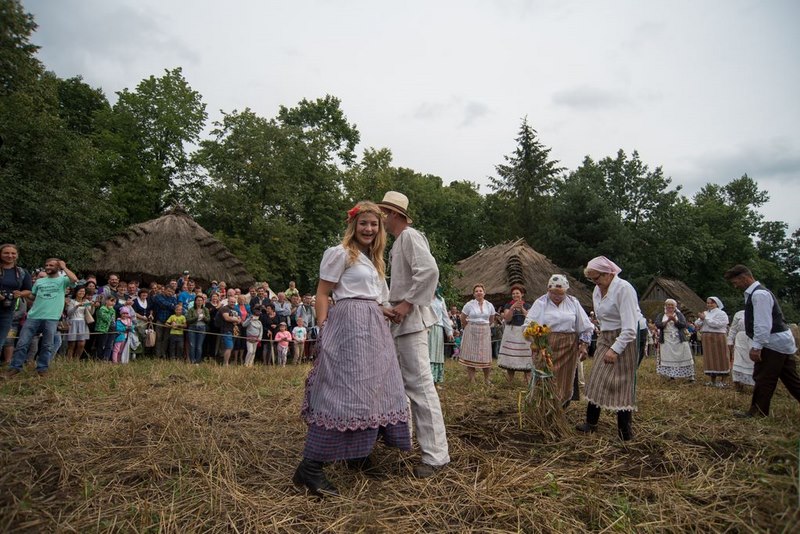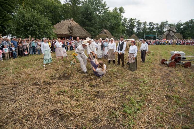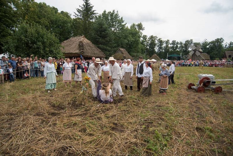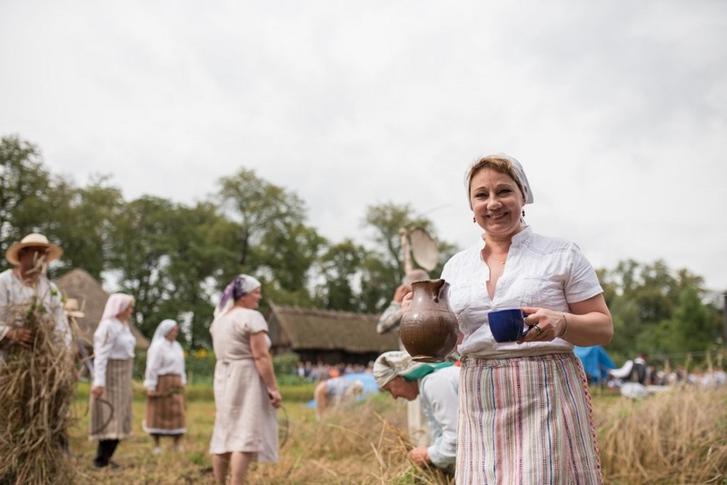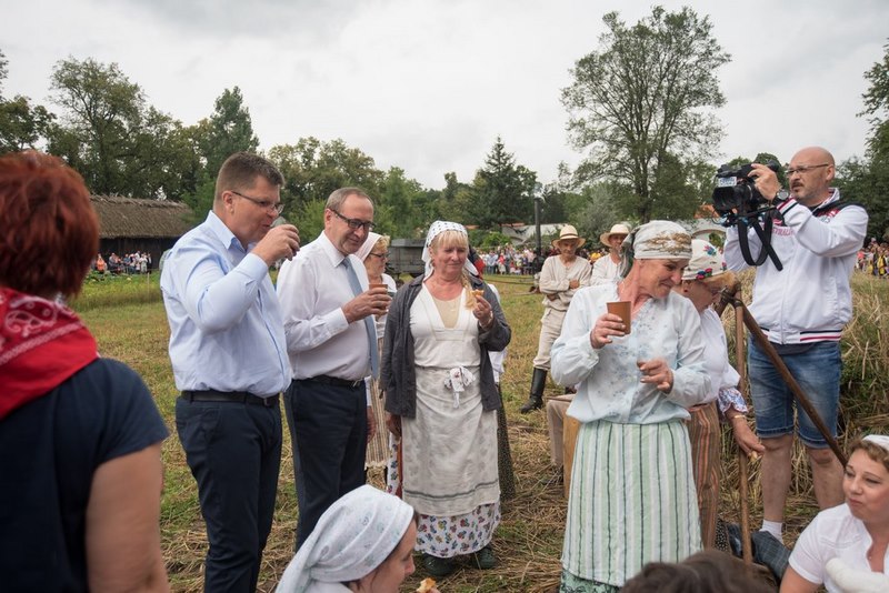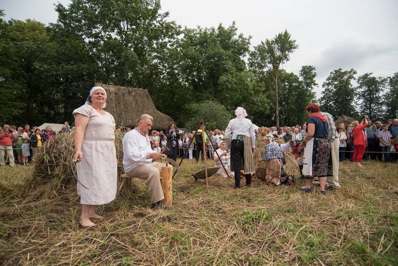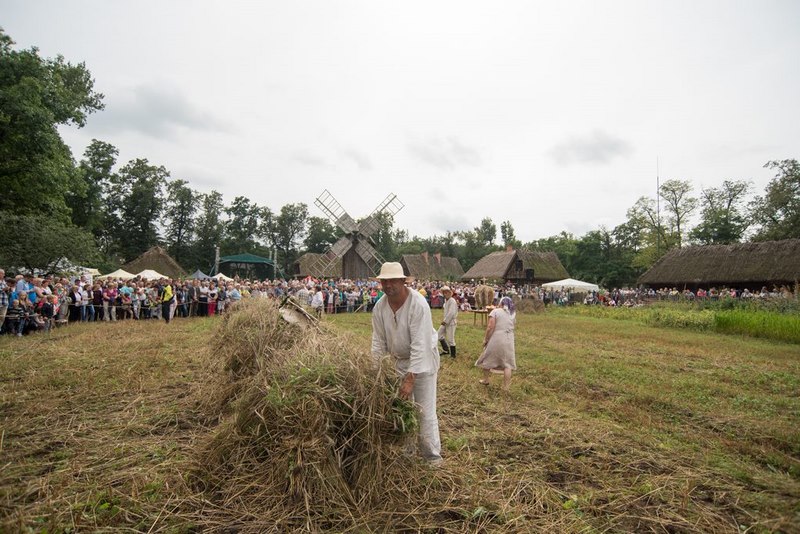 w barwnym korowodzie z równianką, chlebem i wieńcem dożynkowym udali się do dworu, gdzie gospodarze po uroczystym powitaniu ugościli ich, wyprawiając dożynki. Następnym punktem prac polowych był pokaz młócenia zboża młocarnią Warmianką MSC-7 z 1984 r. napędzaną lokomobilą z 1922 r. firmy „HEINRICH LANZ” z Mannheim. Zboże młócone było również tradycyjną młocarnią szerokomłotną SM 1-A z 1959 r. napędzaną silnikiem stacjonarnym S-320 z 1964 r. Równolegle w jednej ze stodół na skansenie odbywał się pokaz młócenia zboża cepami na klepisku.