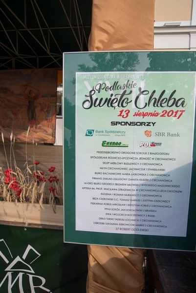Sponsorami Podlaskiego Święta Chleba byli również: Spółdzielczy Bank Rozwoju w Szepietowie, Przedsiębiorstwo Drogowe SOKOLIK Białystok, Pol-Krusz Zbigniew Wojno z Szepietowa, ENERGO Sp. z o.o. Importer węgla kamiennego z Bielska Podlaskiego, Spółdzielnia Rolniczo-Spożywcza JEDNOŚĆ w Ciechanowcu, Sklep Meblowy BUDLEWSCY z Ciechanowca, Młyn Ciechanowiec Jachimczuk i Stanisławski, Biuro Rachunkowe Maria Laskowska w Ciechanowcu, PRIMAG Zakład Usługowy Danuta Kiliszek z Ciechanowca, M-Geo Biuro Geodezji Zbigniew Milewski Wysokie Mazowieckie, Apteka im. prof. W. Strażewicza Lech Chochlew z Ciechanowca, Eugenia i Roman Murawscy z Ciechanowca, Piekarnia KOBUS Mirosław i Krystyna Kobus z Ciechanowca, Cukiernia BEZA Ciszkowscy z Ciechanowca, PPHU SOKÓŁ Jan Sokołowski z Brańska, Ewa i Wojciech Boczkowscy z Rudki, DekoTaras Tadeusz Łochnicki z Ciechanowca.