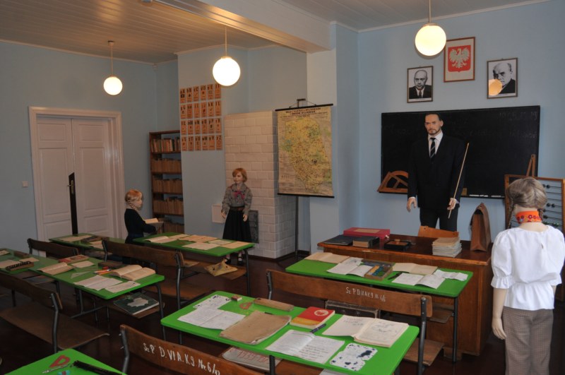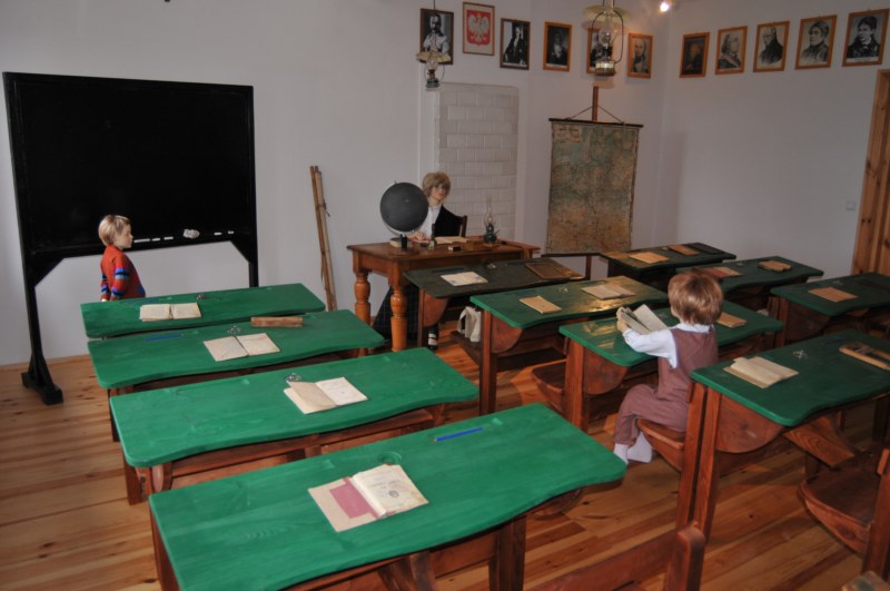 W sali szkolnej z lat 30-tych XX w. drewniane tornistry, ławki z wpuszczonymi kałamarzami, ośla ławka, dyscyplina skórzana i woreczki z grochem do klęczenia. W klasie z lat 60-tych XX w. oryginalne zeszyty szkolne z początku lat 70-tych XX w., zestawy pomocy naukowych. W obu salach są manekiny nauczycieli i dzieci ubrane w oryginale stroje stosowne do epoki. W sali historycznej oprócz fotografii z lat 30-tych, 50-tych, 70-tych, 80-tych i 90-tych XX w. na uwagę zasługują oryginalne dzienniki szkolne ze Szkoły Podstawowej w Winnie Chroły z lat 20-tych i 30-tych XX w., rozkład zajeć z roku szkolnego 1939/40 z poprawkami naniesionymi przez sowieckie władze oświatowe po zajęciu tych terenów po agresji ZSRR po 17 września 1939 roku. Na korytarzu prezentowane są oryginalne dyplomy ze Szkoły Podstawowej w Winnie Chroły z lat 60-tych, 70-tych, 80-tych, 90-tych XX wieku. W mieszkaniu nauczyciela jest m.in. telewizor z lat 60-tych, żelazne łóżko, a nad nim obraz Matki Boskiej Hodyszewskiej, dalej kącik higieniczny z parawanem oraz etażerka z kompletem dzieł Lenina. W pokoju nauczycielskim jest m.in. oryginalny dziennik zajęć pozalekcyjnych z 1972 roku oraz czarny ebonitowy telefon na korbkę. Pomieszczenia zostały starannie zaaranżowane i wyposażone w odpowiednie dla danych okresów sprzęty szkolne.