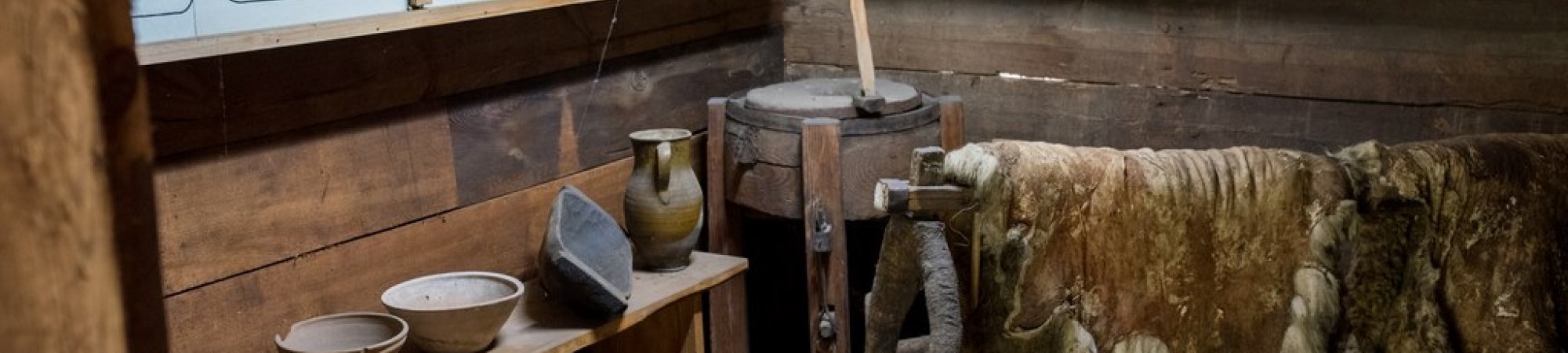 W spichlerzu znajduje się ekspozycja poświęcona rzemiosłom związanym z obróbką skór. Należało do nich zwłaszcza garbarstwo, rymarstwo i szewstwo. Skóry zwierząt domowych stanowiły niezwykle ważny surowiec, używany do szycia uprzęży na konie, do wyrobu niezbędnych w gospodarstwie rzemieni oraz obuwia. Ze skór owczych szyto kożuchy i czapki na zimę. Szyciem uprzęży skórzanej zajmował się rymarz, szyciem butów i ich naprawą szewc, a szyciem kożuchów kuśnierz. Na wystawie urządzonej we wnętrzu spichlerza można obejrzeć narzędzia, którymi posługiwali się owi rzemieślnicy oraz wytwory pracy ich rąk.