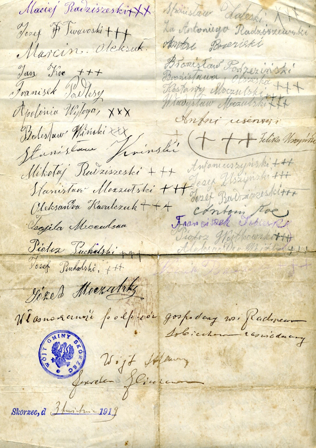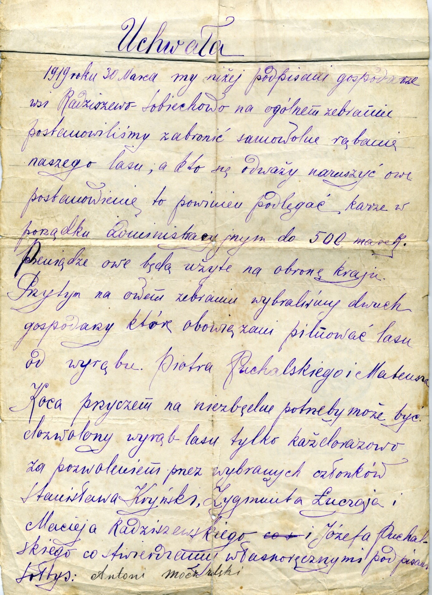 1919 roku 30 marca my niżej podpisani gospodarze wsi Radziszewo Sobiechowo na ogólnem zebraniu postanowiliśmy zabronić samowolne rąbanie naszego lasu, a kto się odważy naruszyć owe postanowienie to powinien podlegać karze w porządku administracyjnym do 500 marek. Pieniądze owe będą użyte na obronę kraju. Przy tym na owem zebraniu wybraliśmy dwuch gospodarzy które obowiązani pilnować lasu od wyrębu, Piotra Puchalskiego i Mateusza Koca przyczem na niezbędne potrzeby może być dozwolony wyrąb lasu tylko każdorazowo za pozwoleniem przez wybranych członków Stanisława Kryńskiego, Zygmunta Łuczaja, Macieja Radziszewskiego i Józefa Puchalskiego co stwierdzamy własnoręcznymi podpisami.