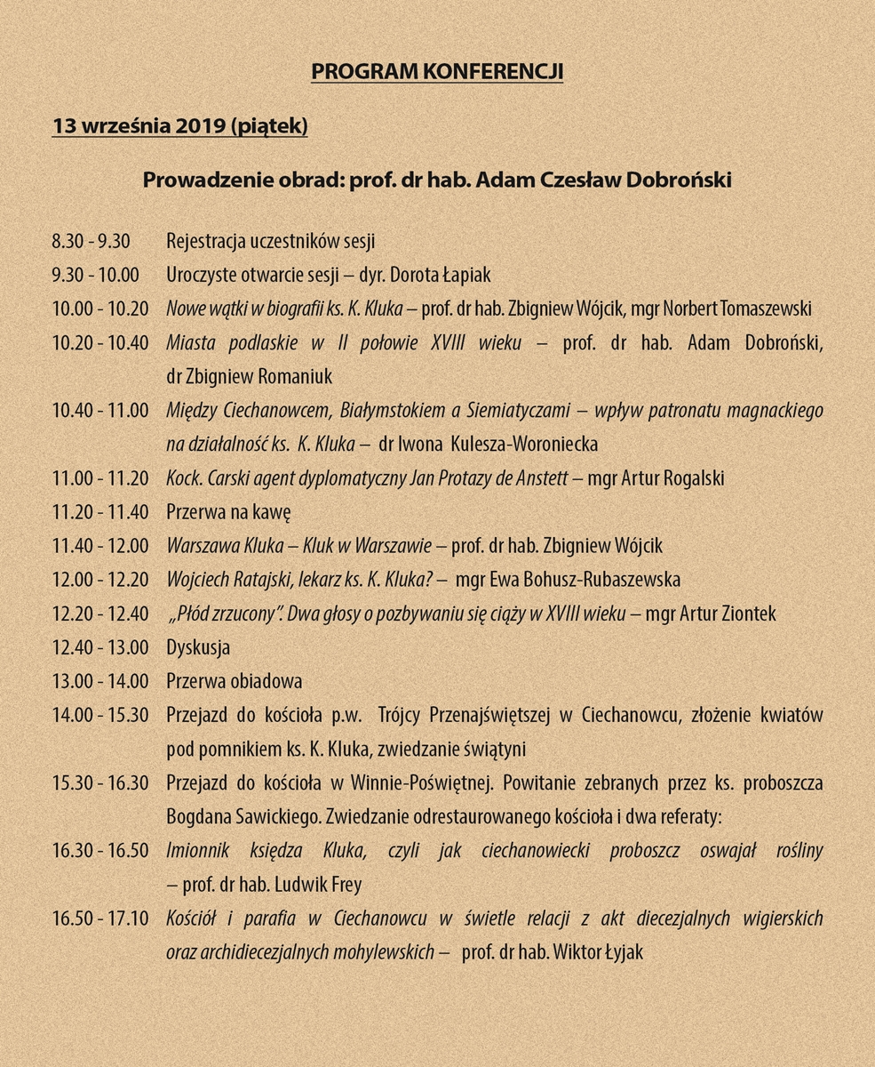 Konferencja Naukowa "Miasta, miasteczka i miejscowości związane z ks. Janem Krzysztofem Klukiem" 13-14 września 2019 r.