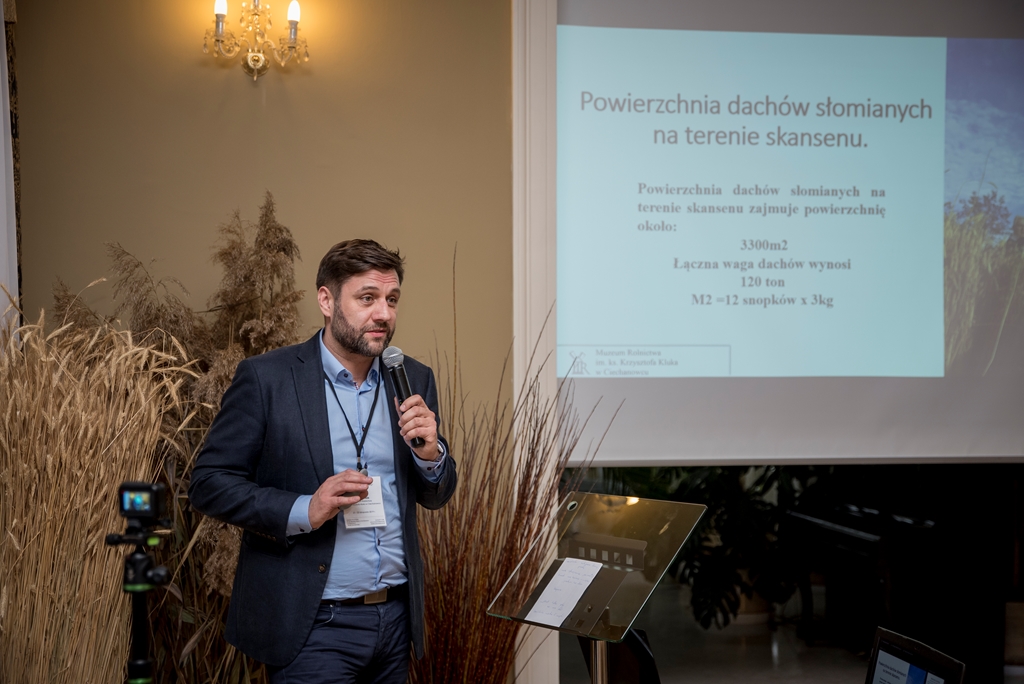 Ciekawe zagadnienie poruszył kustosz Działu Zielarstwa z naszego muzeum -mgr inż. Piotr Kiersnowski, który zaprezentował, w jaki sposób wykorzystywana jest słoma, którą każdego roku zrzucamy z dachów podczas ich wymiany. Użycie starej słomy