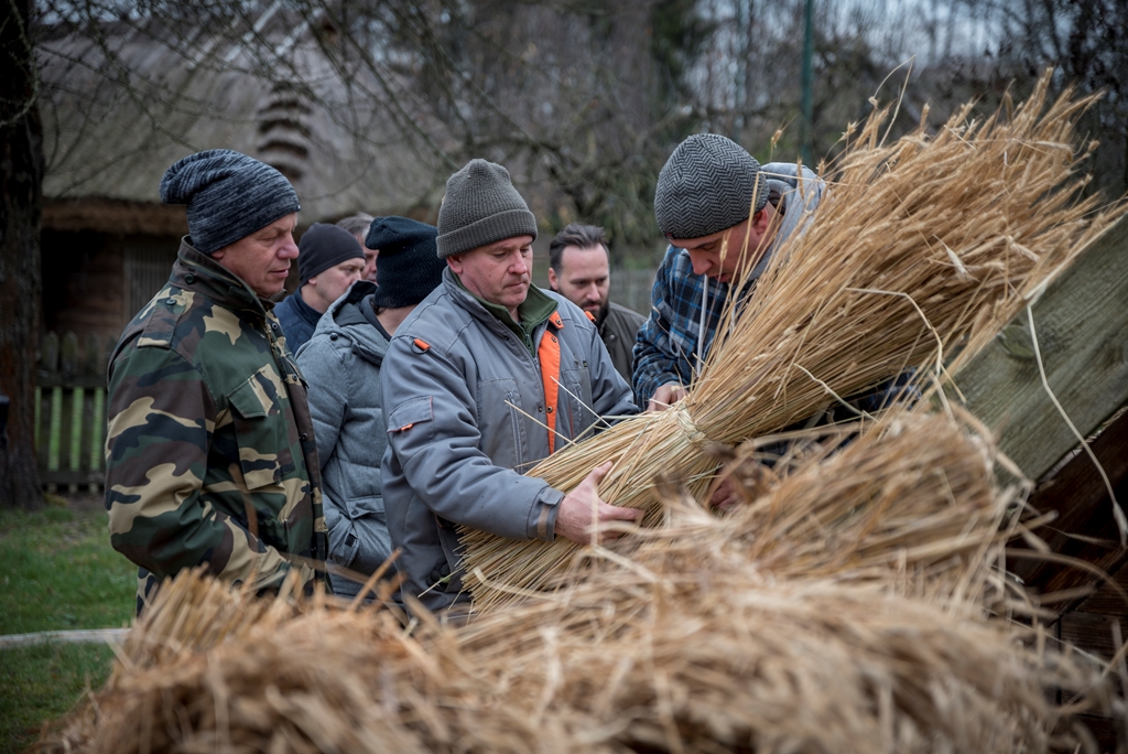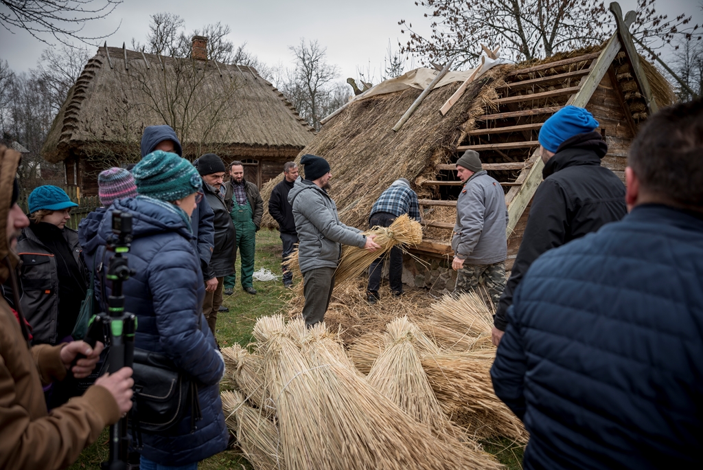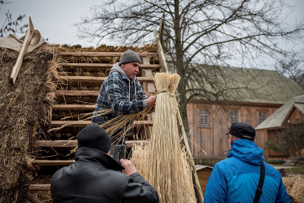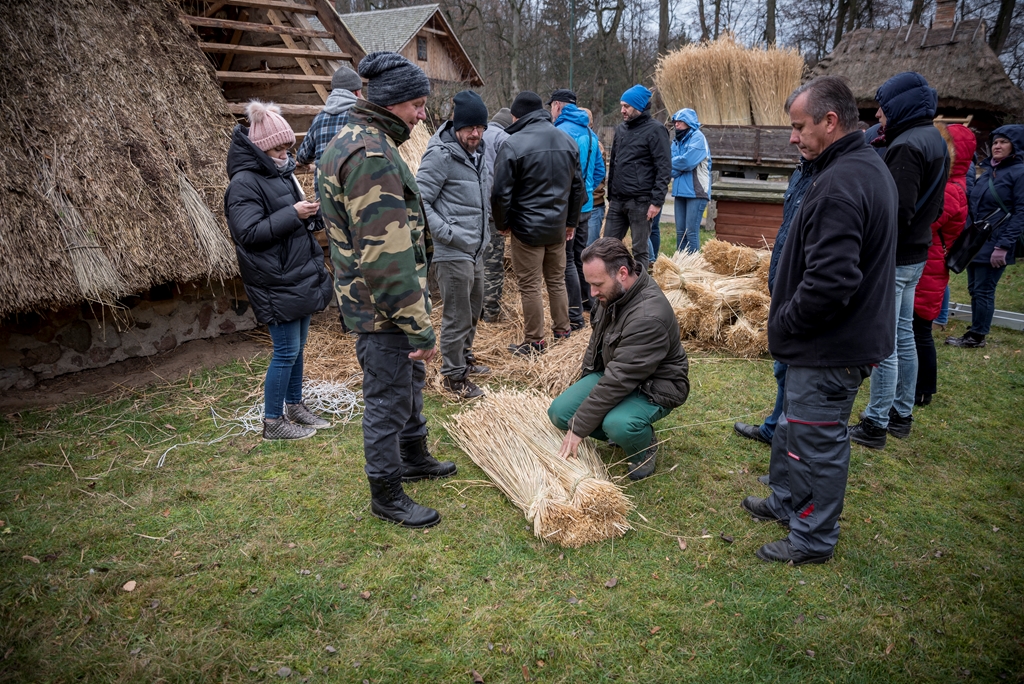 i Piotr Karpiński, rzemieślnicy naszego muzeum. Na początku w stodole uczestnicy szkolili się w wykręcaniu „główczaków” i „strzeszaków”. Są to nazwy dwóch rodzajów snopków używanych do pokrywania dachów na naszym terenie. W trakcie trwania warsztatów toczyły się zażarte dyskusje na tematy związane z naturalnymi pokryciami dachów i wymiany doświadczeń obecnych na spotkaniu „strzecharzy” z Tokarni, Radomia, Opola