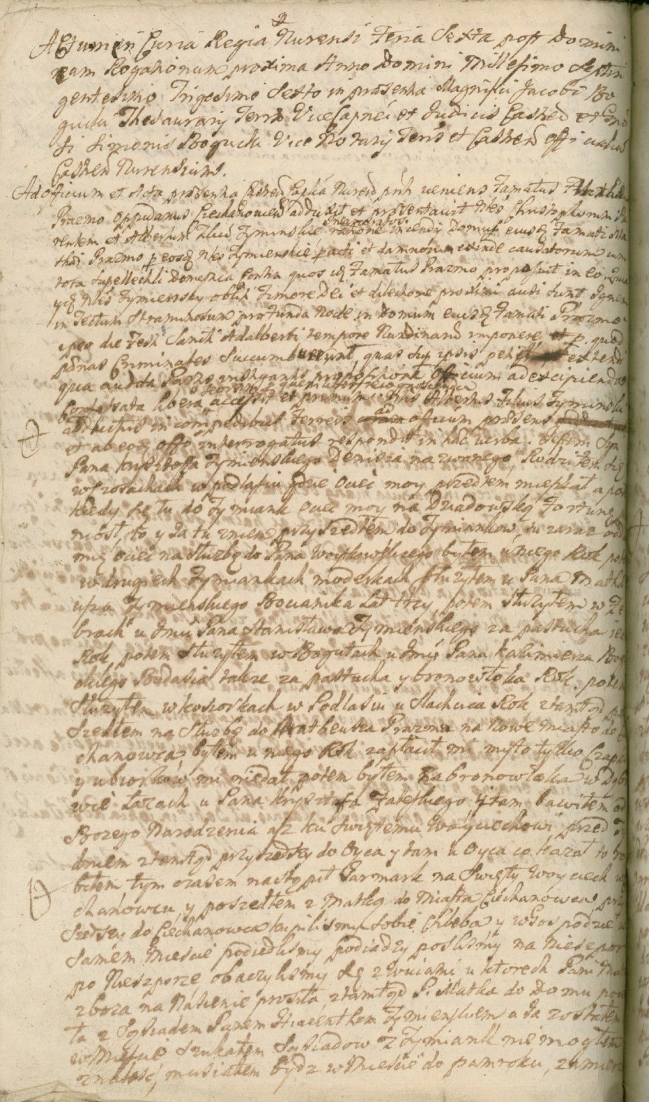 Stało się to we wtorek, w dzień św. Wojciecha, dziś tydzień, w Ciechanowcu podczas jarmarku. Nie wiem, co za słowa sobie rodzic z nieboszczykiem Piętką mówili, czy nieboszczyk, czyli też rodzicowi memu nieboszczyk Piętka okazję dał, bom natenczas odszedł był i powracając obaczyłem rodzica swego przez próg z sieni na rynek pchniętego, leżącego od tego nieboszczyka Piętki, a nieboszczyk z rohatyną w sieni stojał. Zaraz w tym razie imć pan Andrzej Wyszeński Jałbrzyk przybył z gromadą, tak że nie wiem, kto nieboszczyka zabił sztychem przez okno(?), ale nie ja i gotowem się wywieść inkwizycją, i nie znałem go przedtem, tylko co w sieni natenczas widziałem go. A mnie też wzięto i do Imć pana Wyszeńskiego zawieziono.