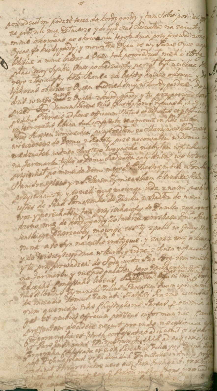 Tamże, nie kontentując jako człowieka spokojnego związali ręce i nogi, na opak powrozami skręcili, do domu przerzeczonego Szczęsnego Łempickiego wyżej mianowanego wprowadzili, tam mękami przedziwnymi dręczyli i ogniem palili, trwożąc go aby spobojenia (czyli ze strachu) rzeczy które sobie przywłaszczyli kwitował, a stamtąd do Radziszewa-Sieńczucha, do domu szlachetnego Stanisława Żery przyprowadzili. Tam woźny i szlachta na przerzeczonym Pawle Porzezińskim powrozami ręce i nogi związane (…) i rękami swymi rozwiązali...