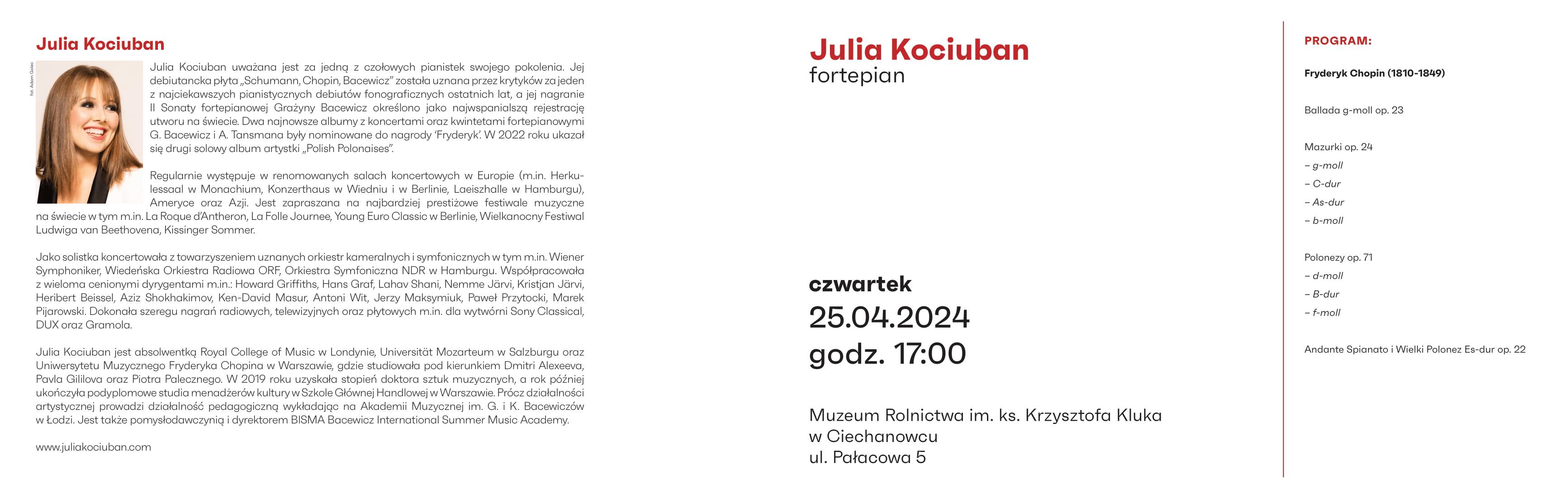 Zapraszamy na koncert z cyklu "Z klasyką przez Polskę” w wykonaniu znakomitej pianistki Julii Kociuban.