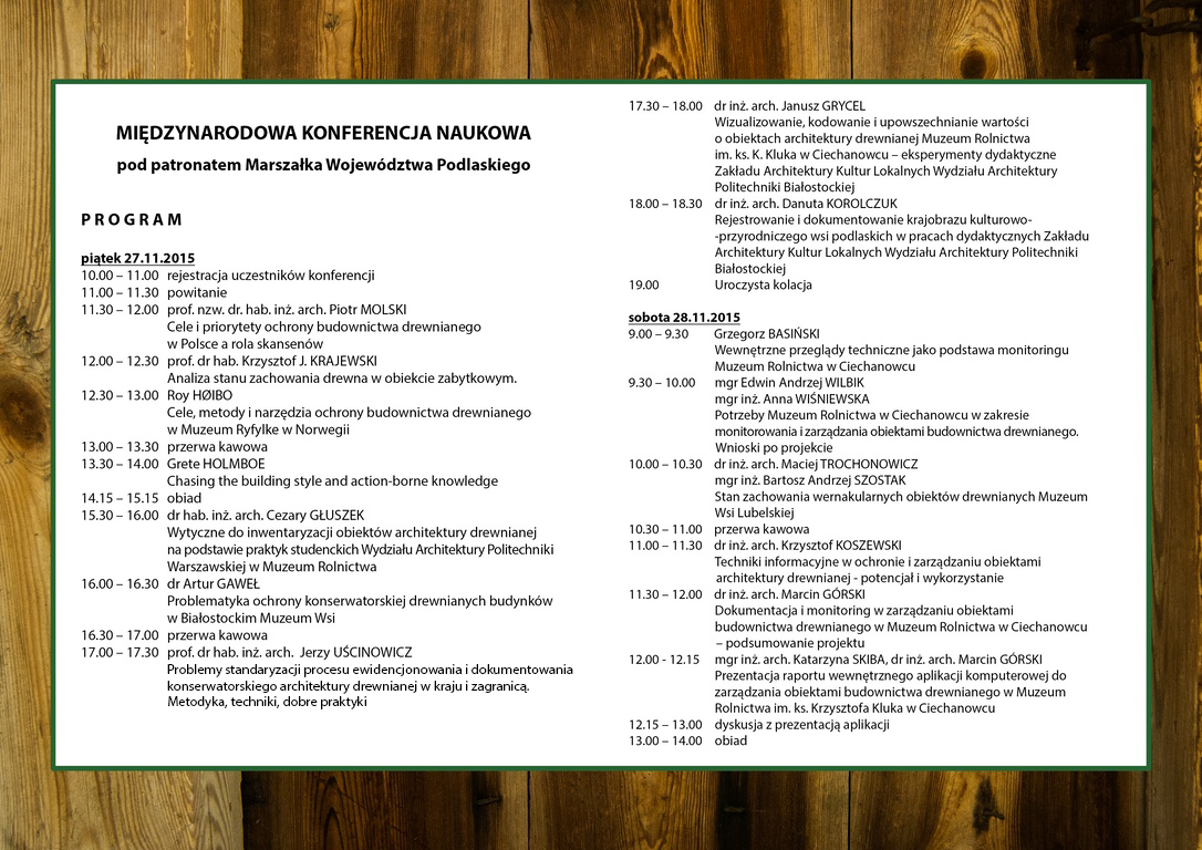 W dniach 27-28 listopada 2015 r w Muzeum odbyła się MIĘDZYNARODOWA KONFERENCJA NAUKOWA pod patronatem Marszałka Województwa Podlaskiego "Dokumentacja i monitoring w zarządzaniu obiektami budownictwa drewnianego w skansenach".