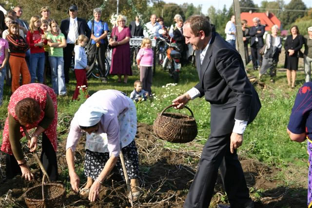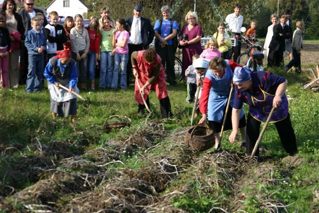 Zespół pań z Białych Szczepanowic zademonstrował na przyległym polu kopanie ziemniaków motykami, do którego włączyli się przedstawiciele władz z Wiceministrem Rolnictwa Jackiem Boguckim na czele.