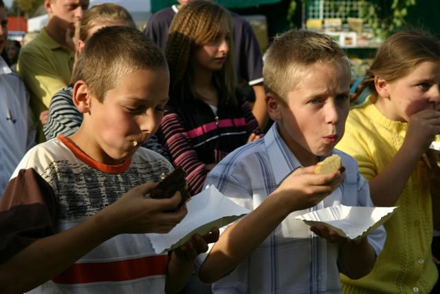 Kilkadziesięcioro dzieci uczestniczyło w konkursach polegających na rzucaniu ziemniakami do koszyka, obieraniu ziemniaków i jedzeniu kiszki ziemniaczanej.