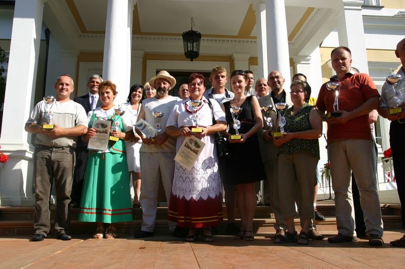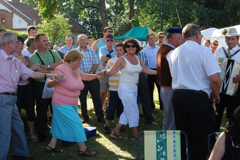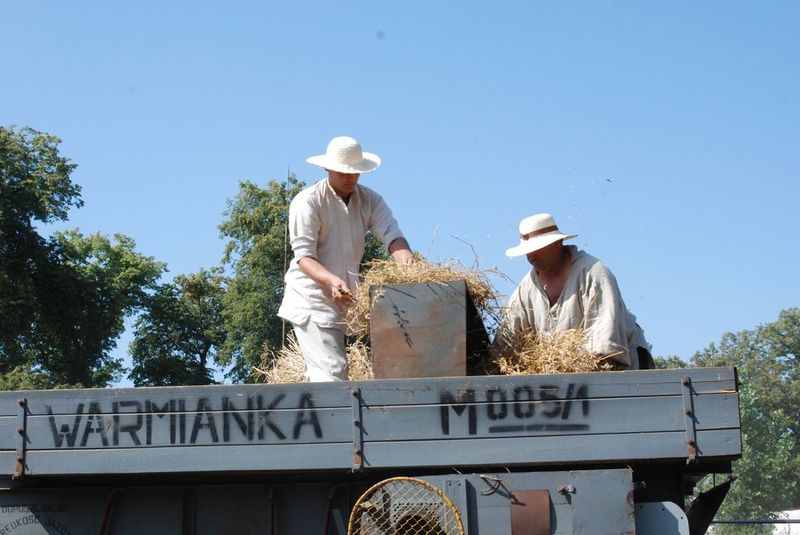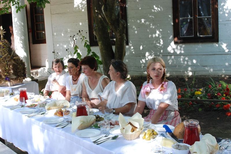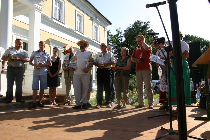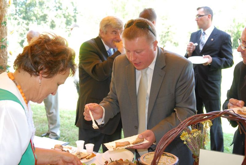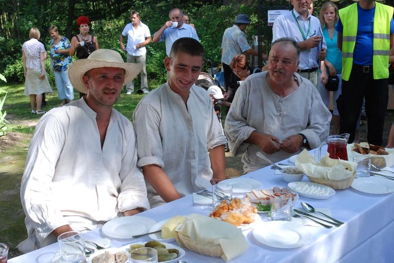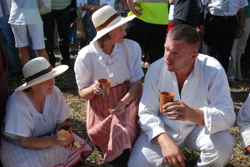 Po dojściu do dworu najmłodsza żniwiarka złożyła chleb na ręce gospodarzy dożynek - Dyrektor Muzeum Doroty Łapiak i Starosty Powiatu Wysokomazowieckiego Bogdana Zielińskiego. Starostowie połamali się chlebem z widzami i zaprosili po ustawieniu wieńca żniwnego na stole żniwiarzy do posiłku. Podczas posiłku żniwiarzy, gospodarzy dożynek i gości śpiewały zespoły „Kalina” i „Klekociaki”.