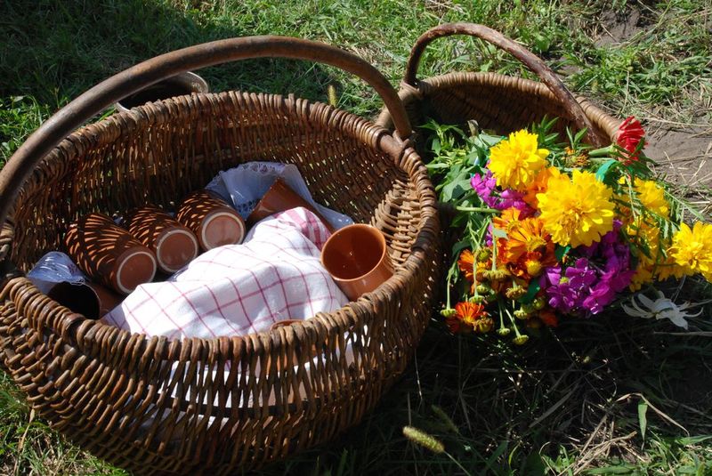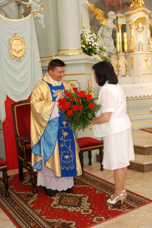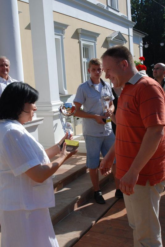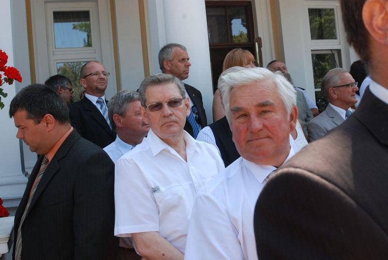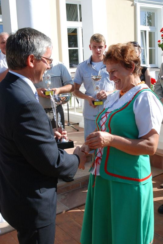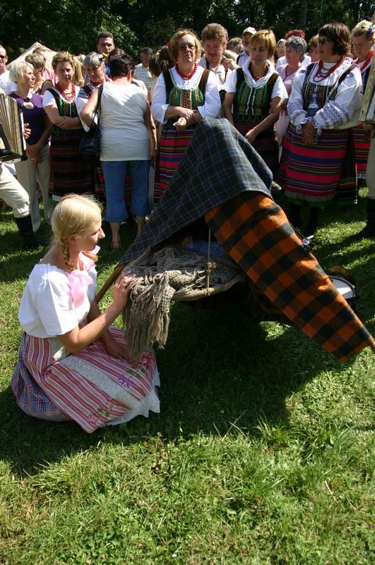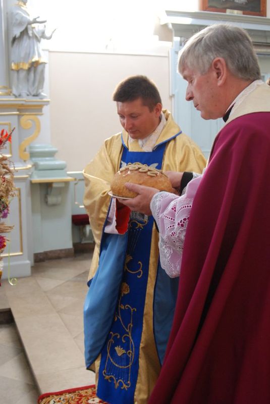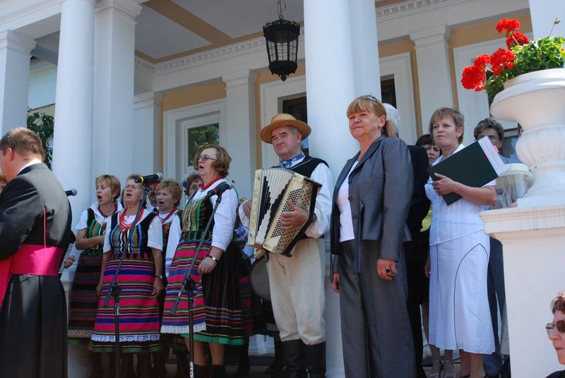 Po dojściu do dworu najmłodsza żniwiarka złożyła chleb na ręce gospodarzy dożynek - Dyrektor Muzeum Doroty Łapiak i Starosty Powiatu Wysokomazowieckiego Bogdana Zielińskiego. Starostowie połamali się chlebem z widzami i zaprosili po ustawieniu wieńca żniwnego na stole żniwiarzy do posiłku. Podczas posiłku żniwiarzy, gospodarzy dożynek i gości śpiewały zespoły „Kalina” i „Klekociaki”.