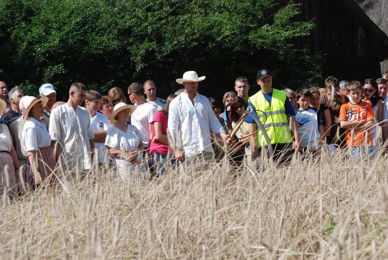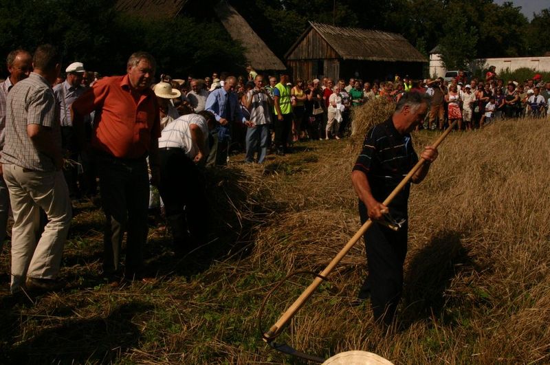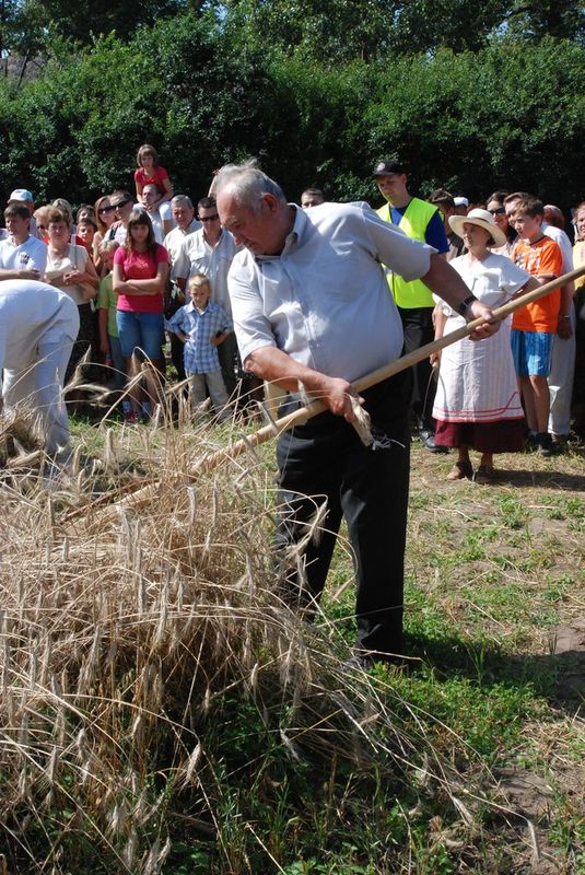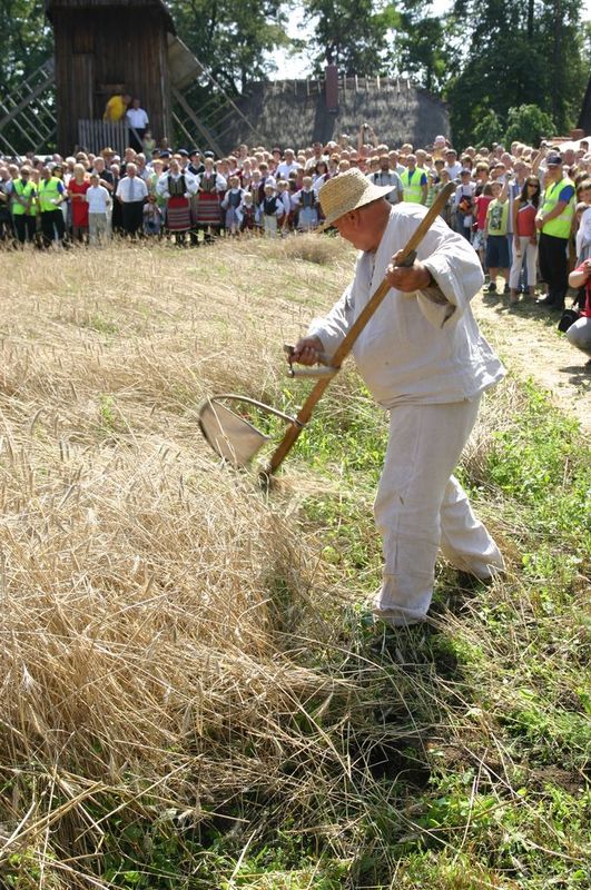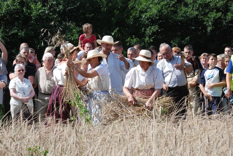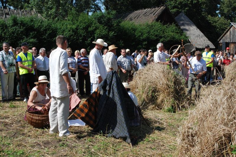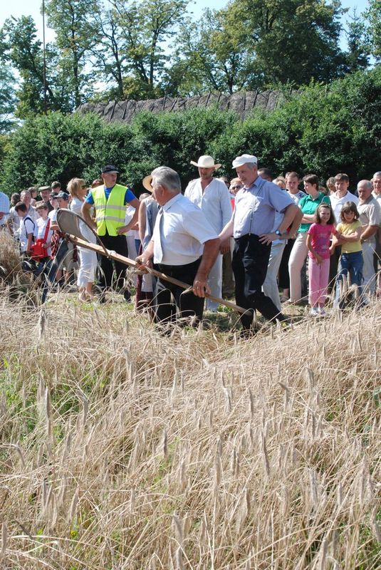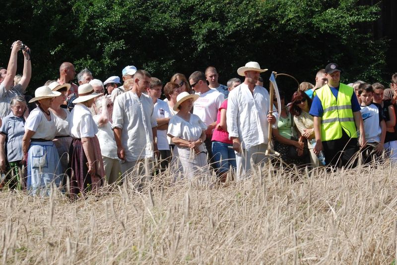 Z tejże zagrody w pole wyruszył orszak żniwny. Na wozie drabiniastym jechali kośnicy z kosami, żniwiarki z sierpami, kołyską polową i dzieckiem - niemowlakiem. Za furmanką szły zespoły folklorystyczne w strojach ludowych „Kalina” z Żurobic i „Klekociaki” z Bociek. Mężczyźni byli ubrani w lniane białe koszule i spodnie oraz słomiane kapelusze a kobiety w lniane koszule, spódnice, fartuchy i słomiane kapelusze. Po przejeździe w pole najstarszy kośnik przeżegnawszy się rozpoczął koszenie, panie podbierały zboże i żyły sierpami. Żęte zboże ustawiano w „dziesiątki”. Najmłodsza żniwiarka opiekowała się dzieckiem ułożonym w kołysce polowej. Zespoły folklorystyczne śpiewały stosowne pieśni żniwne. Do koszenia kosą włączyli się licznie zgromadzeni widzowie. Po skoszeniu połowy zagonu żniwiarze zasiedli do posiłku składającego się z kawy z mlekiem i pampuchów (ciasta drożdżowego smażonego na oleju). Po zakończonym koszeniu na zostawionym małym kawałku żyta panie robiły przepiórkę. Przepiórka składa się z 3 lub 4 warkoczy zboża zdobionego kwiatami polnymi lub ogrodowymi. Starano się nadać jej kształt trójnożny, który posiadał znaczenie płodnościowe. Niekiedy przepiórki okładano jednym, do trzech rzędów kół z kamieni, wytyczając do niej dróżkę dla zające lub przepiórki. W środku na kamieniu symbolizującym ołtarz na białej chusteczce kładziono chleb. Miał on być dla przepiórki i dla myszy aby z pola nie szły do stodoły albo aby go nigdy nie zabrakło. Kamień (ołtarz) i chleb (ofiara) to stary pogański zwyczaj ofiary duchowi zamieszkującemu zboże. Miał on znaczenie magiczne - pomagał na ból zęba, leczył wymowę dzieci, kobiety ciężarne zbierały chleb z 3 przepiórek i spożywały przed porodem. Po przystrojeniu klękano i odmawiano „Ojcze Nasz…” i składano prośby do Boga o opiekę nad zbożem w przyszłym roku. Przepiórka zrobiona w polu przez żniwiarki została oborana przez młodych wysokich mężczyzn najmłodszą żniwiarką. Oboranie polegało na przeciągnięciu gołym tyłkiem 3 razy po rżysku. Miało to znaczenie magiczne - przekazanie ziemi przez organy płciowe młodej, obowiązkowo cnotliwej dziewczyny siłą płodności. Gdyby dziewczyna była pozbawiona cnoty groziłoby to w następnym roku nieurodzajem. Po oboraniu przepiórki na pole na wozie ciągniętym przez traktor Ursus C-45 z 1959 roku, wjechali mężczyźni w lnianych koszulach i spodniach w słomianych kapeluszach do omłotów do sterty zboża. Omłoty zostały dokonane za pomocą młocarni „Warmianka” z 1984 roku napędzaną silnikiem parowym - lokomobilą z 1922 roku opalaną drewnem. Po omłotach orszak żniwny ruszył do dworu do gospodarzy dożynek. Przy śpiewie „Plon, niesiemy plon…” najmłodsza żniwiarka którą oborywano przepiórkę niosła bochen chleba wypieczony w piekarni „Kobus” w Ciechanowcu, a 2 chłopców i 2 dziewczyny z zespołu „Klekociaki” niosło wieniec dożynkowy. Obrzęd dożynkowy jest związany z dworem od połowy XIX wieku. W czasie międzywojennym zwyczaj ten przejął Kościół i władze państwowe i tak to trwa do dziś. Pierwotnie był to wieniec niesiony na głowie przez „postatnicę” - najbardziej „wydajną” żniwiarkę. Później (w XX w) wieniec był robiony na kształt wieńca na głowie o kształcie koła u podstawy z półkoliście wygiętymi na górze warkoczami ze zbóż. Taki też wieniec był niesiony w pochodzie żniwnym na Święcie Chleba w Ciechanowcu. Zwieńczony był na górze krzyżem.