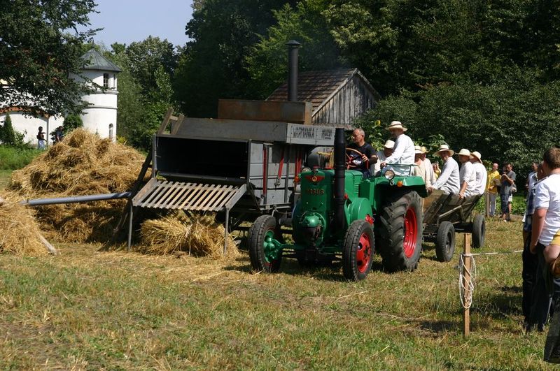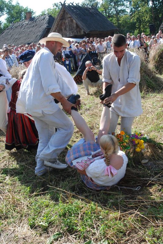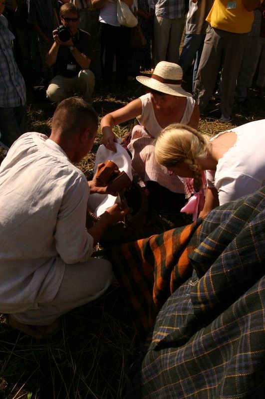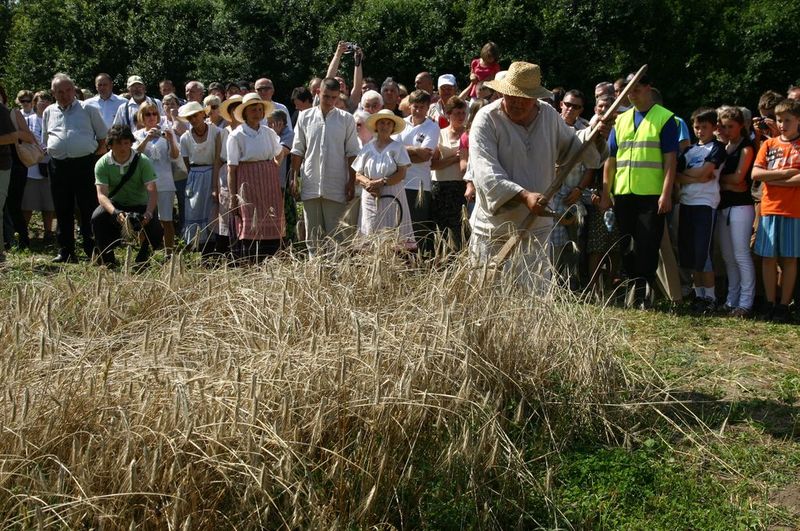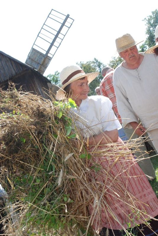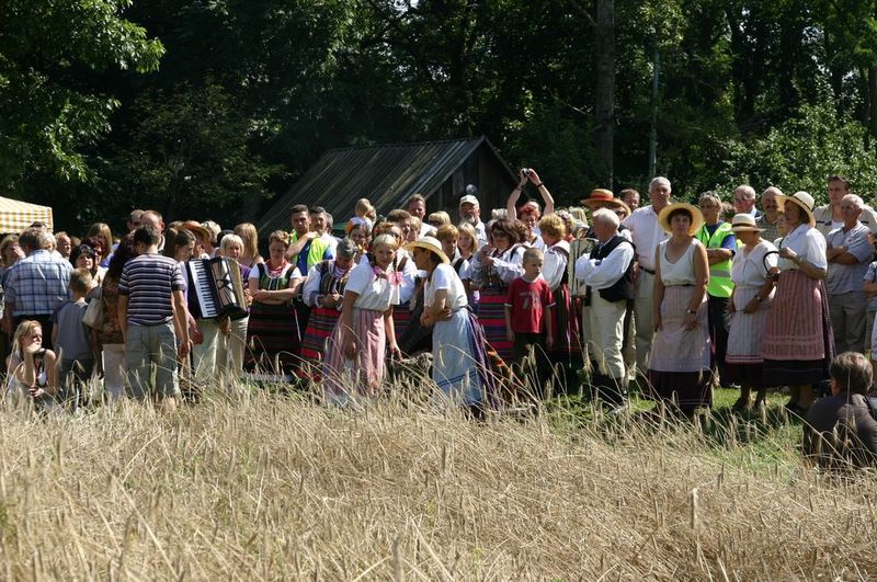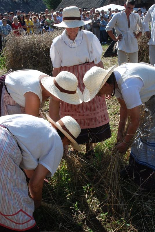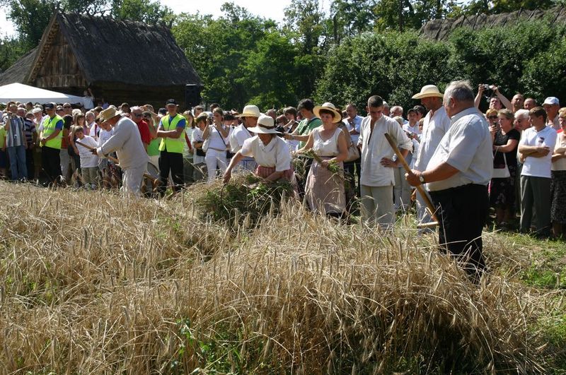 Z tejże zagrody w pole wyruszył orszak żniwny. Na wozie drabiniastym jechali kośnicy z kosami, żniwiarki z sierpami, kołyską polową i dzieckiem - niemowlakiem. Za furmanką szły zespoły folklorystyczne w strojach ludowych „Kalina” z Żurobic i „Klekociaki” z Bociek. Mężczyźni byli ubrani w lniane białe koszule i spodnie oraz słomiane kapelusze a kobiety w lniane koszule, spódnice, fartuchy i słomiane kapelusze. Po przejeździe w pole najstarszy kośnik przeżegnawszy się rozpoczął koszenie, panie podbierały zboże i żyły sierpami. Żęte zboże ustawiano w „dziesiątki”. Najmłodsza żniwiarka opiekowała się dzieckiem ułożonym w kołysce polowej. Zespoły folklorystyczne śpiewały stosowne pieśni żniwne. Do koszenia kosą włączyli się licznie zgromadzeni widzowie. Po skoszeniu połowy zagonu żniwiarze zasiedli do posiłku składającego się z kawy z mlekiem i pampuchów (ciasta drożdżowego smażonego na oleju). Po zakończonym koszeniu na zostawionym małym kawałku żyta panie robiły przepiórkę. Przepiórka składa się z 3 lub 4 warkoczy zboża zdobionego kwiatami polnymi lub ogrodowymi. Starano się nadać jej kształt trójnożny, który posiadał znaczenie płodnościowe. Niekiedy przepiórki okładano jednym, do trzech rzędów kół z kamieni, wytyczając do niej dróżkę dla zające lub przepiórki. W środku na kamieniu symbolizującym ołtarz na białej chusteczce kładziono chleb. Miał on być dla przepiórki i dla myszy aby z pola nie szły do stodoły albo aby go nigdy nie zabrakło. Kamień (ołtarz) i chleb (ofiara) to stary pogański zwyczaj ofiary duchowi zamieszkującemu zboże. Miał on znaczenie magiczne - pomagał na ból zęba, leczył wymowę dzieci, kobiety ciężarne zbierały chleb z 3 przepiórek i spożywały przed porodem. Po przystrojeniu klękano i odmawiano „Ojcze Nasz…” i składano prośby do Boga o opiekę nad zbożem w przyszłym roku. Przepiórka zrobiona w polu przez żniwiarki została oborana przez młodych wysokich mężczyzn najmłodszą żniwiarką. Oboranie polegało na przeciągnięciu gołym tyłkiem 3 razy po rżysku. Miało to znaczenie magiczne - przekazanie ziemi przez organy płciowe młodej, obowiązkowo cnotliwej dziewczyny siłą płodności. Gdyby dziewczyna była pozbawiona cnoty groziłoby to w następnym roku nieurodzajem. Po oboraniu przepiórki na pole na wozie ciągniętym przez traktor Ursus C-45 z 1959 roku, wjechali mężczyźni w lnianych koszulach i spodniach w słomianych kapeluszach do omłotów do sterty zboża. Omłoty zostały dokonane za pomocą młocarni „Warmianka” z 1984 roku napędzaną silnikiem parowym - lokomobilą z 1922 roku opalaną drewnem. Po omłotach orszak żniwny ruszył do dworu do gospodarzy dożynek. Przy śpiewie „Plon, niesiemy plon…” najmłodsza żniwiarka którą oborywano przepiórkę niosła bochen chleba wypieczony w piekarni „Kobus” w Ciechanowcu, a 2 chłopców i 2 dziewczyny z zespołu „Klekociaki” niosło wieniec dożynkowy. Obrzęd dożynkowy jest związany z dworem od połowy XIX wieku. W czasie międzywojennym zwyczaj ten przejął Kościół i władze państwowe i tak to trwa do dziś. Pierwotnie był to wieniec niesiony na głowie przez „postatnicę” - najbardziej „wydajną” żniwiarkę. Później (w XX w) wieniec był robiony na kształt wieńca na głowie o kształcie koła u podstawy z półkoliście wygiętymi na górze warkoczami ze zbóż. Taki też wieniec był niesiony w pochodzie żniwnym na Święcie Chleba w Ciechanowcu. Zwieńczony był na górze krzyżem.