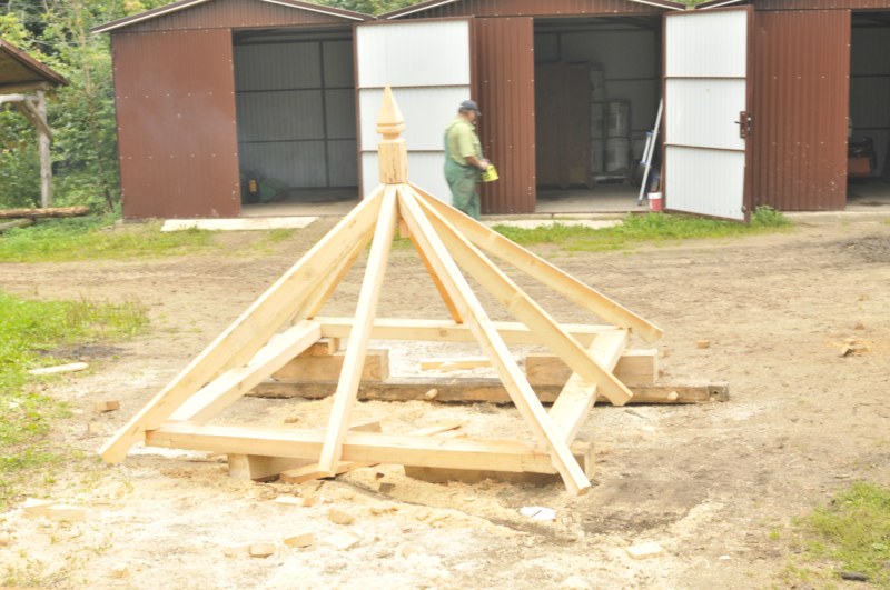 Na podwalinach zbudowano zrąb sosnowy konstrukcji sumikowo-łątkowej, którą przykrywa brogowy dach. Pokryty łupaną dranką osikową, w kalenicy zdobiony pazdurem. Rzut poziomy więźby tworzy "piątnicę", która stała się motywem rozstawu otworów wentylacyjnych. Obiekt jest orientowany wejściem w stronę południową, którego drzwi zdobi "Piątnica" tworząca krzyż, wskazując cztery strony świata.