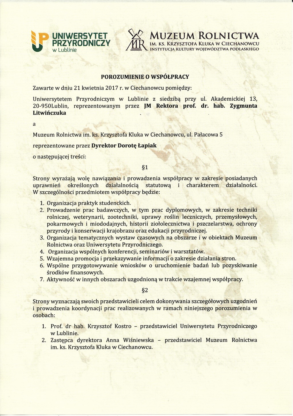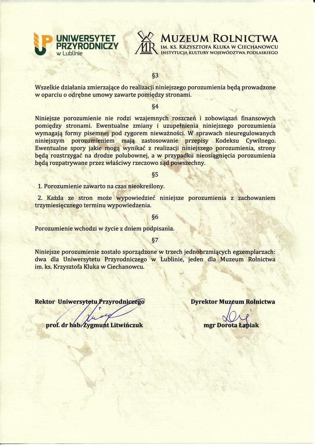 W dniu 21 kwietnia 2017 r. zostało podpisane pierwsze porozumienie o współpracy pomiędzy Rektorem Uniwersytetu Przyrodniczego w Lublinie prof. dr hab. Zygmuntem Litwińczukiem a Dyrektorem Muzeum Rolnictwa w Ciechanowcu Dorotą Łapiak w zakresie problematyki przyrodniczej oraz współdziałania stron w dziedzinach wzajemnego zainteresowania.