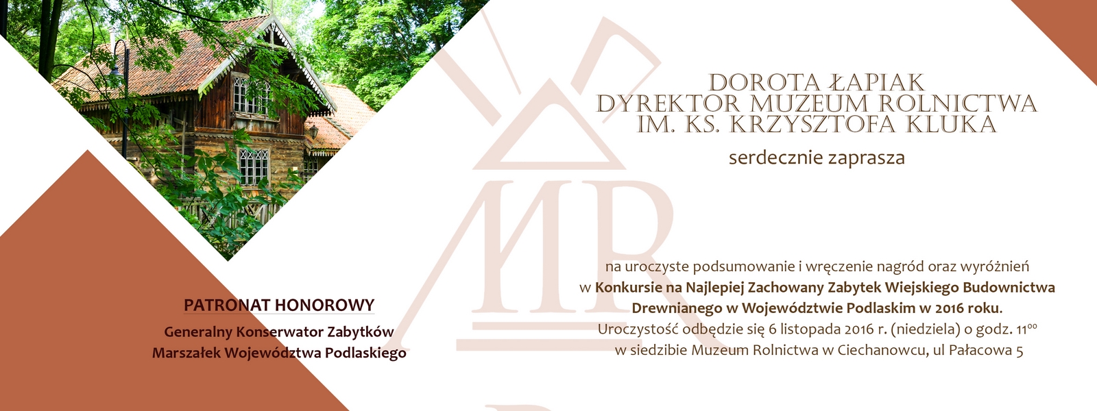 Dorota Łapiak Dyrektor Muzeum Rolnictwa im. ks. Krzysztofa Kluka w Ciechanowcu serdecznie zaprasza na uroczyste podsumowanie i wręczenie nagród oraz wyróżnień w Konkursie na Najlepiej Zachowany Zabytek Wiejskiego Budownictwa Drewnianego w Województwie Podlaskim w 2016 roku.