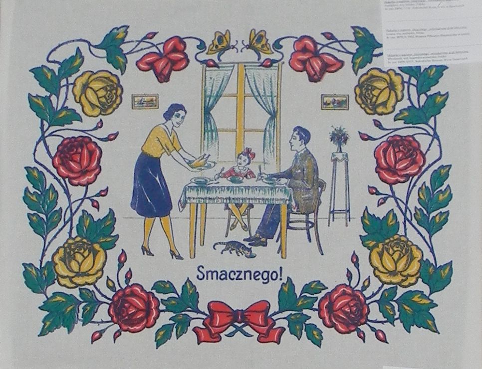 Spotykamy również makatki z martwą naturą, np. rokokowe kosze, wstążki, bukiety kwiatów lub kosz owoców (również egzotycznych) z napisem Smacznego lub na wzór zagranicznych - Dobrego Apetytu. Pokarmy przedstawiane na makatkach, symbolizować miały dostatek np. chleb kojarzony był z obfitością.