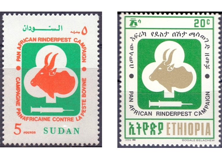 Znaczki pocztowe – Sudan, 1991, offset, nr kat. Michel SD 458, Pan African Rinderpest Campaign / Campagne Panafricane Contre la Peste Bovine; Etiopia, 1992, nr kat. ET 1420, Pan African Rinderpest Campaign.