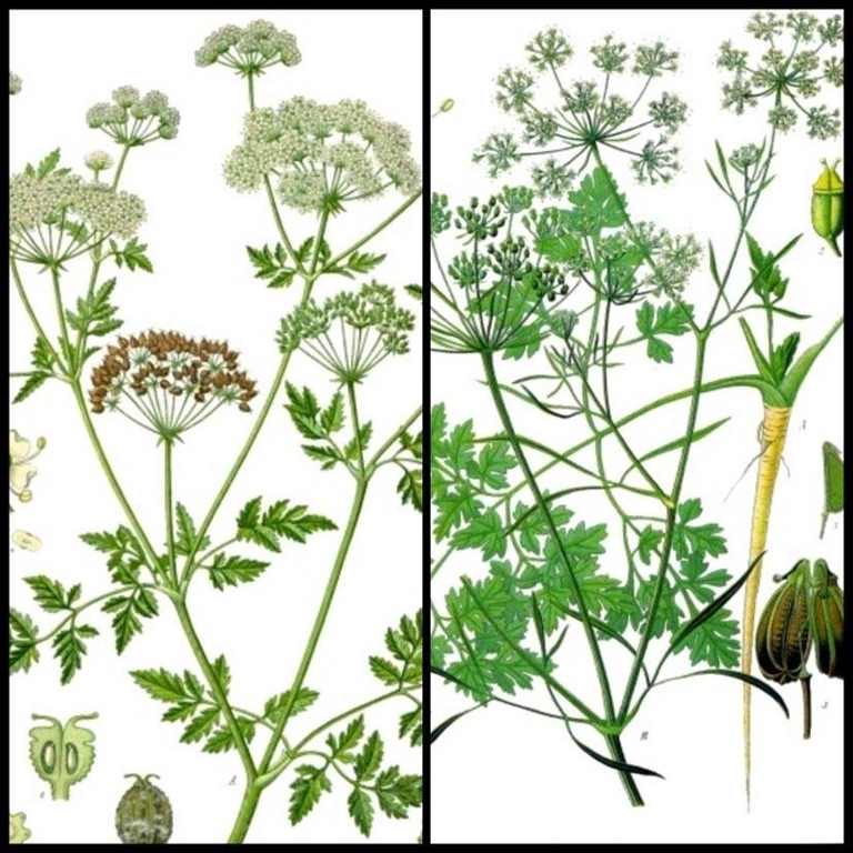 Pietruszka versus szczwół plamisty: „świnia wesz plamista od pietruszki różni się, że we wszystkich swoich częściach nie ma pietruszczanego zapachu, że ma liście drobniey podzielone y ciemnieysze, że ma nasiona bardziey okrągłe iak iaiowe” (K.Kluk „Dykcyonarz roślinny”)