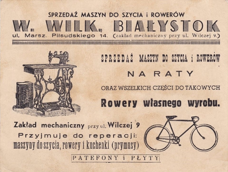 Firma „W. Wilk” funkcjonowała w Białymstoku w latach 1926-1939 i mieściła się przy ulicy Lipowej 14, (ul. Marszałka Piłsudzkiego 14) vis a vis cerkwi św. Mikołaja. Sklep firmowy prowadził sprzedaż maszyn do szycia, rowerów, motorowerów, kuchenek typu prymus, patefonów i płyt. Natomiast zakład mechaniczny firmy znajdował się nomen omen przy ul. Wilczej 9. Tam przyjmowano do naprawy sprzęt gospodarstwa domowego, pojazdy (rowery i motorowery różnych firm i wytwórców). Pod tym adresem Wolf Wilk rozpoczął produkcję rowerów po własnym szyldem „W. Wilk - Białystok”.