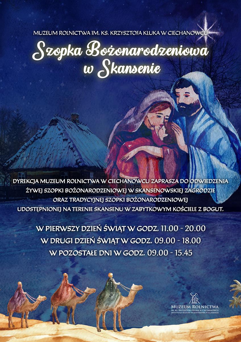Dyrekcja Muzeum Rolnictwa w Ciechanowcu zaprasza do odwiedzenia żywej szopki bożonarodzeniowej w skansenowskiej zagrodzie oraz tradycyjnej szopki bożonarodzeniowej udostępnionej na terenie skansenu w zabytkowym kościele z Bogut.