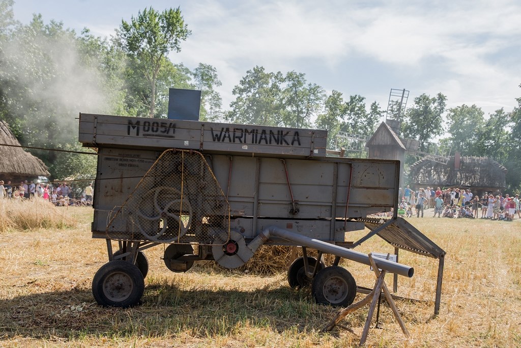 Skoszone zboże jeszcze na polu zostało wymłócone młocarnią napędzaną lokomobilą.