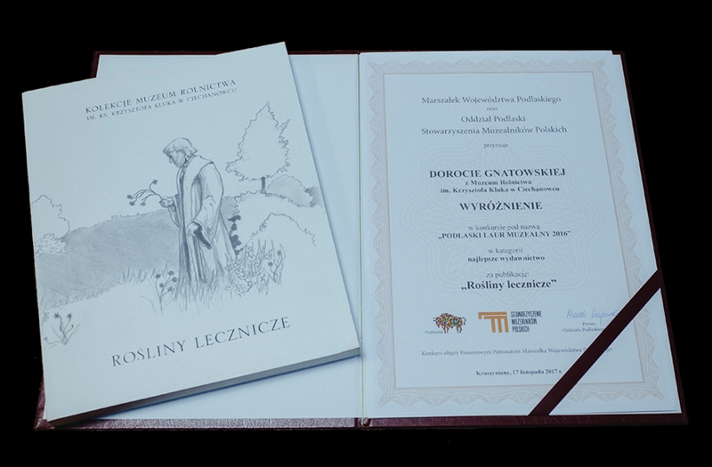 W miniony piątek, 17 listopada, z wielką przyjemnością wzięliśmy udział w jubileuszu 15-lecia Oddziału Podlaskiego Stowarzyszenia Muzealników Polskich. Główne uroczystości odbyły się w Centrum Edukacji i Kultury Muzułmańskiej Tatarów Polskich w Kruszynianach. Muzealnicy podlascy świętowali, nie zabrakło jednak czasu i na dyskusję o problemach muzealnictwa i na snucie planów na przyszłość. W trakcie uroczystości wręczone zostały nagrody w XV już edycji konkursu na najciekawsze wydarzenie muzealne roku w regionie podlaskim. Miło nam poinformować, że wyróżnienie w kategorii NAJLEPSZE WYDAWNICTWO otrzymała nasza publikacja „Rośliny lecznicze” autorstwa Doroty Gnatowskiej. Ponadto honorowy LAUR WDZIĘCZNOŚCI został przyznany pośmiertnie Kazimierzowi Uszyńskiemu, współzałożycielowi i wieloletniemu dyrektorowi Muzeum Rolnictwa w Ciechanowcu, za wybitne osiągnięcia i działalność na rzecz Stowarzyszenia.