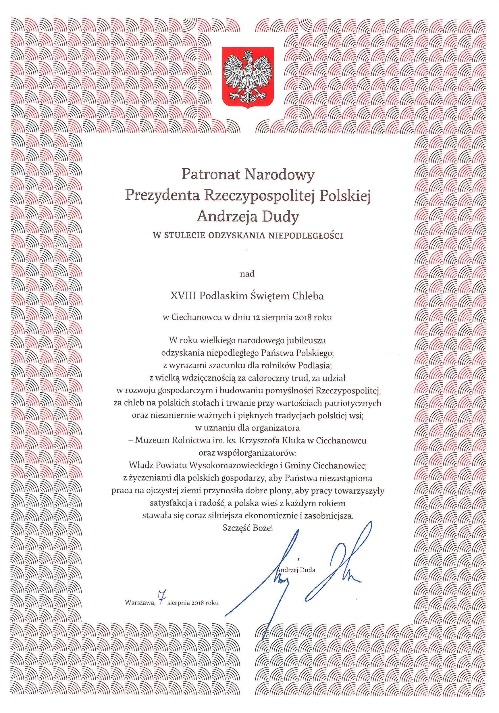 Wydarzenie objęte Patronatem Narodowym Prezydenta Rzeczypospolitej Polskiej Andrzeja Dudy w Stulecie Odzyskania Niepodległości 1918-2018